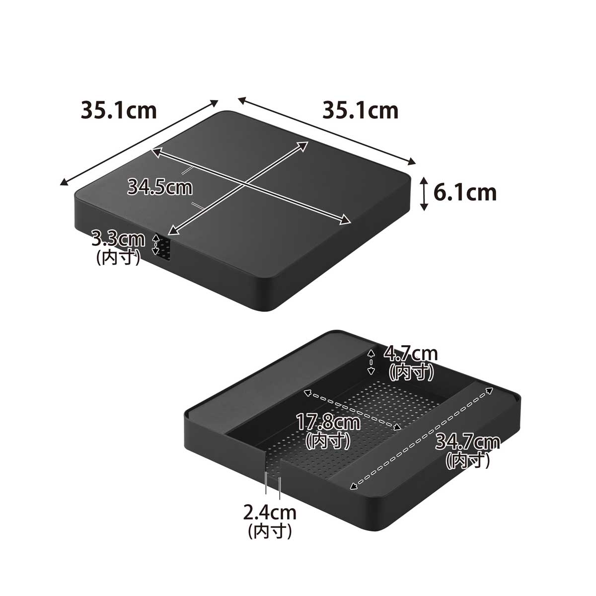 ・内寸サイズ:約W345xD345mm(天板)/約W178xD347XH47mm(天板下収納部)/約W24xH33mm(配線通し口)