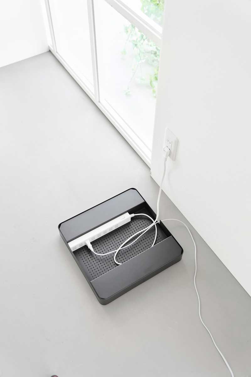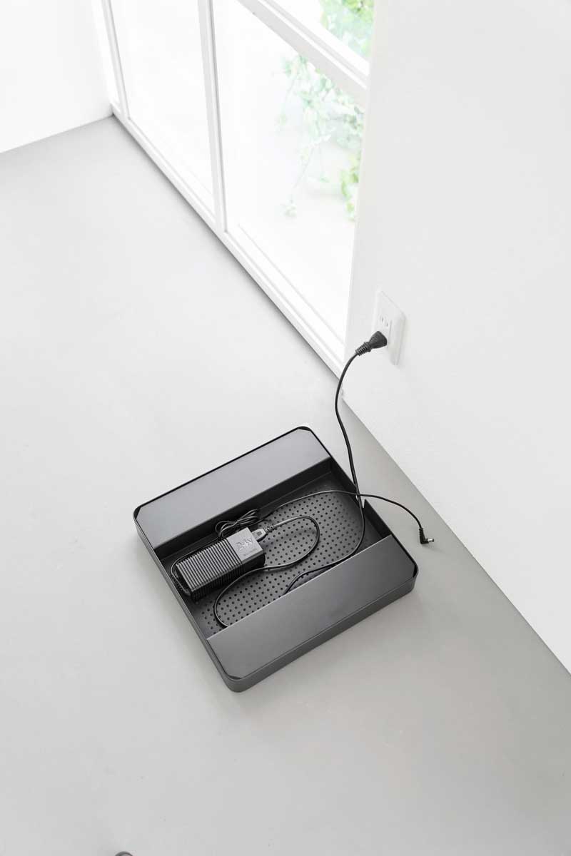 アダプターや電源タップのほこりの蓄積を防げる、スチール製の収納付き台車です。収納部は通気性がよく熱がこもりにくい構造で、配線通し口も付いているのでケーブル類も背面にスッキリ整理できます。