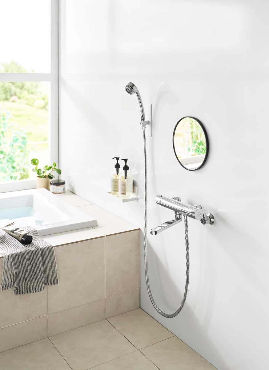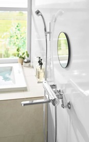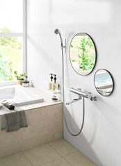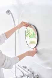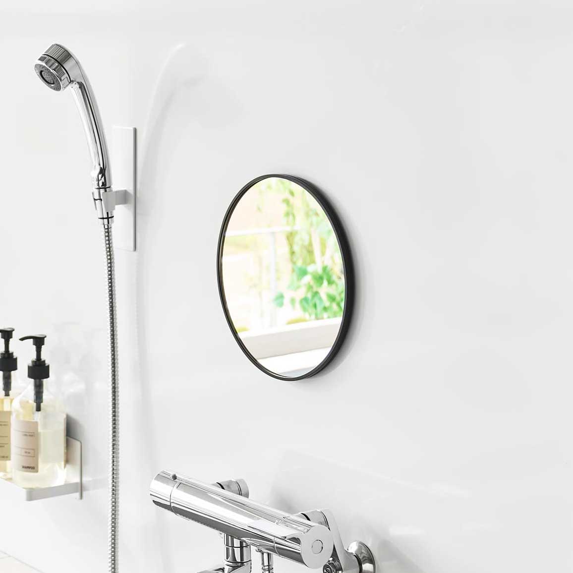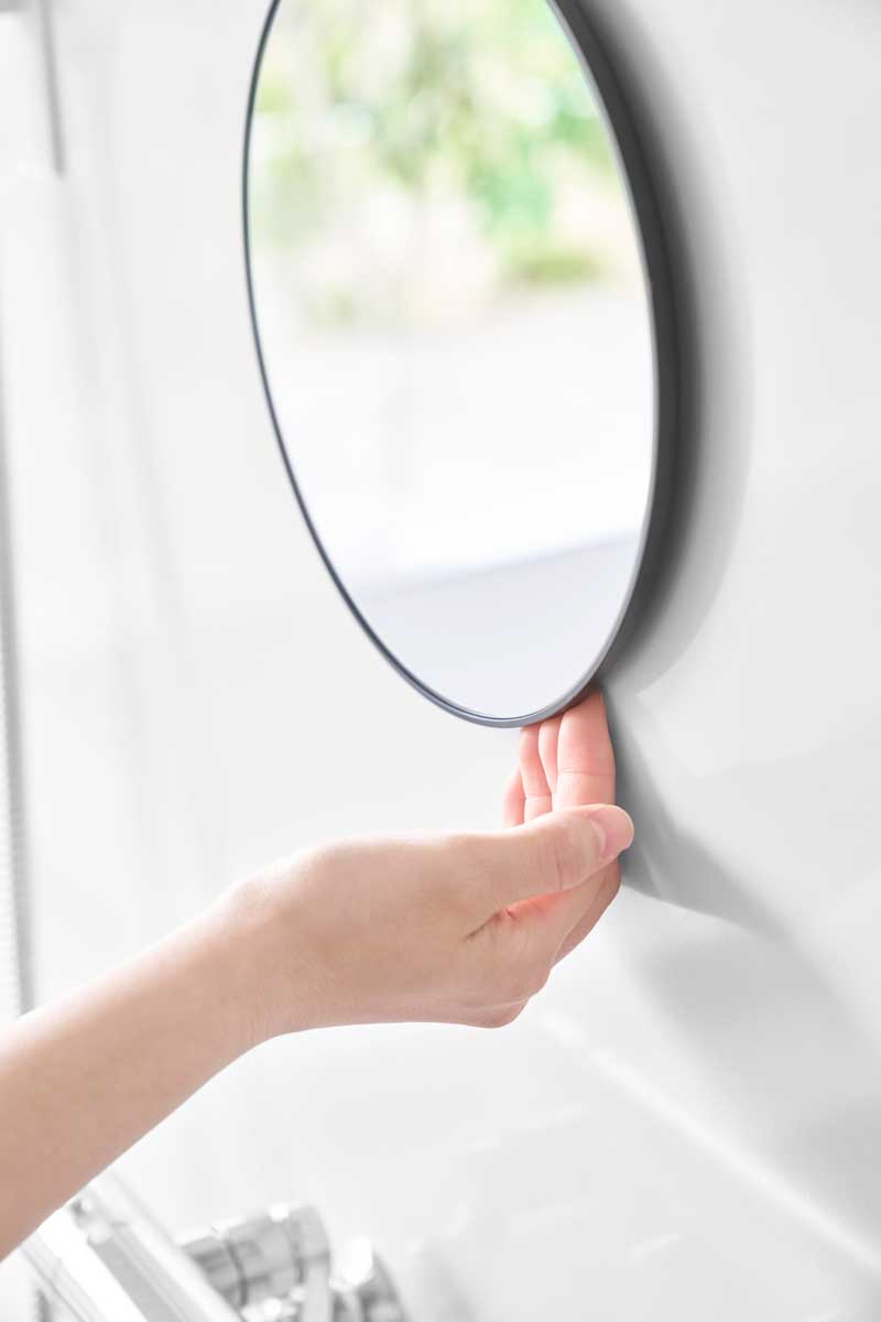 美しく、透明感がある直径23cmの丸型ガラス製バスルームミラーです。フレームと壁の隙間に指を入れて取り外しやすい形状なので、お掃除がしやすく清潔に保てます。曇り止めフィルムを全面に粘着加工しているため、鏡面が曇らず快適にお使いいただけます。
