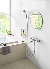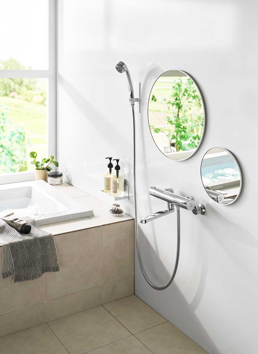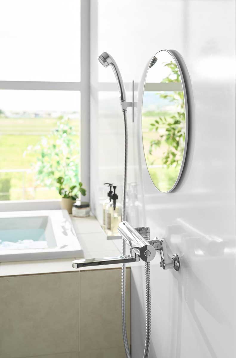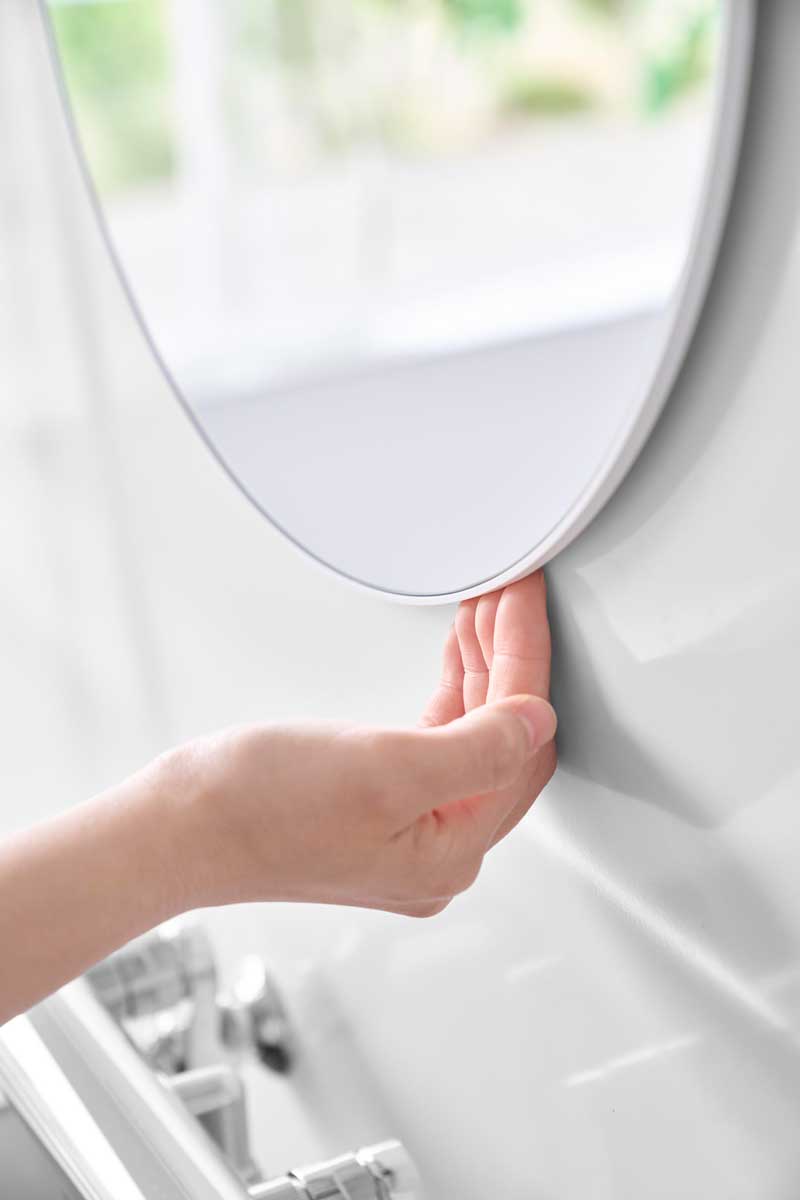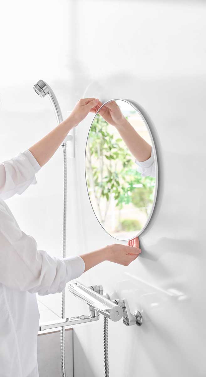 美しく、透明感がある直径42cmの丸型ガラス製バスルームミラーです。フレームと壁の隙間に指を入れて取り外しやすい形状なので、お掃除がしやすく清潔に保てます。曇り止めフィルムを全面に粘着加工しているため、鏡面が曇らず快適にお使いいただけます。