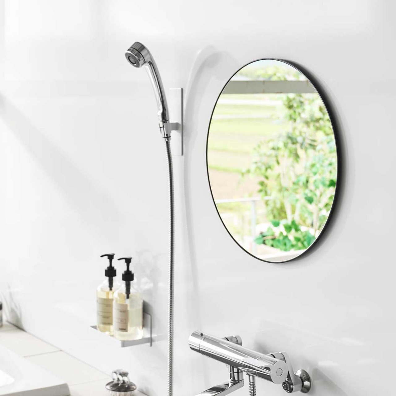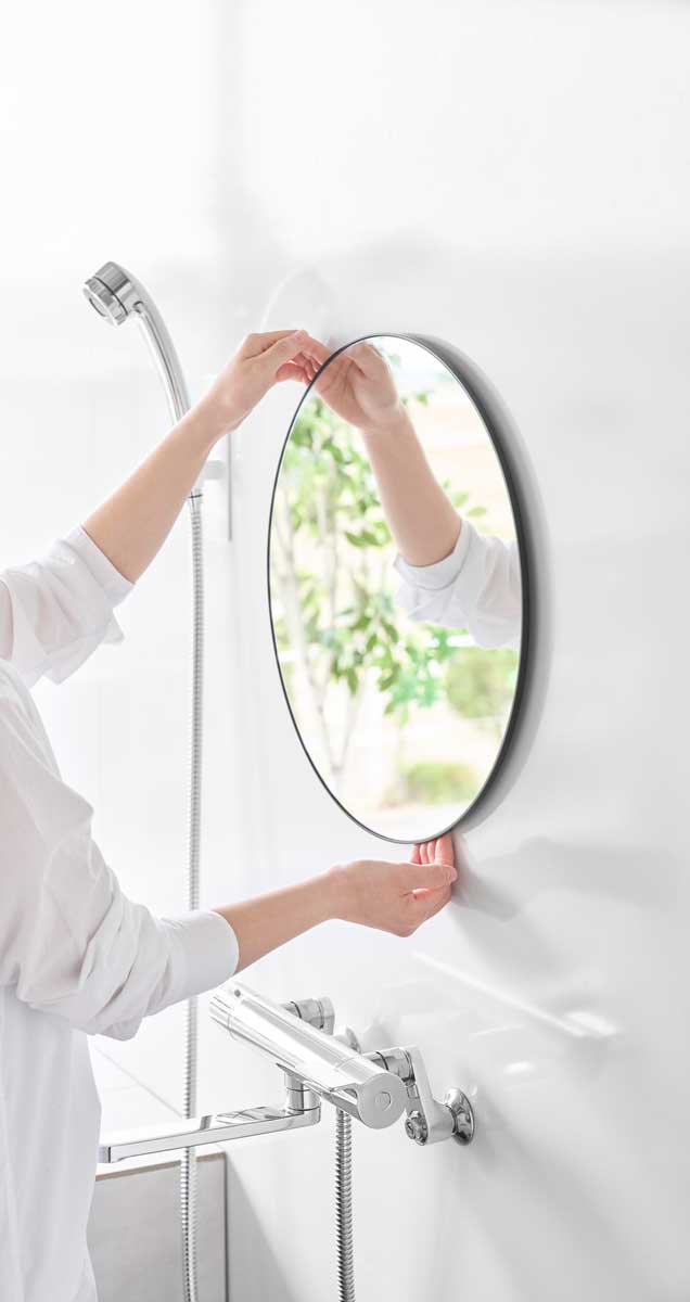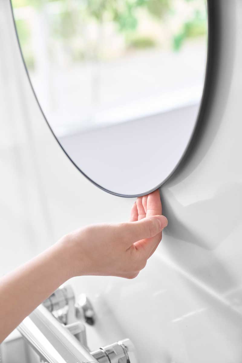 美しく、透明感がある直径42cmの丸型ガラス製バスルームミラーです。フレームと壁の隙間に指を入れて取り外しやすい形状なので、お掃除がしやすく清潔に保てます。曇り止めフィルムを全面に粘着加工しているため、鏡面が曇らず快適にお使いいただけます。