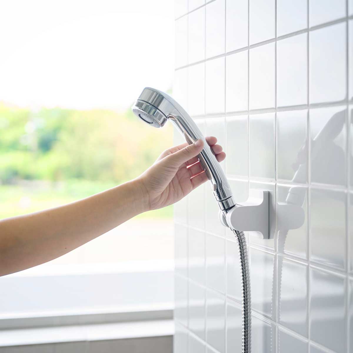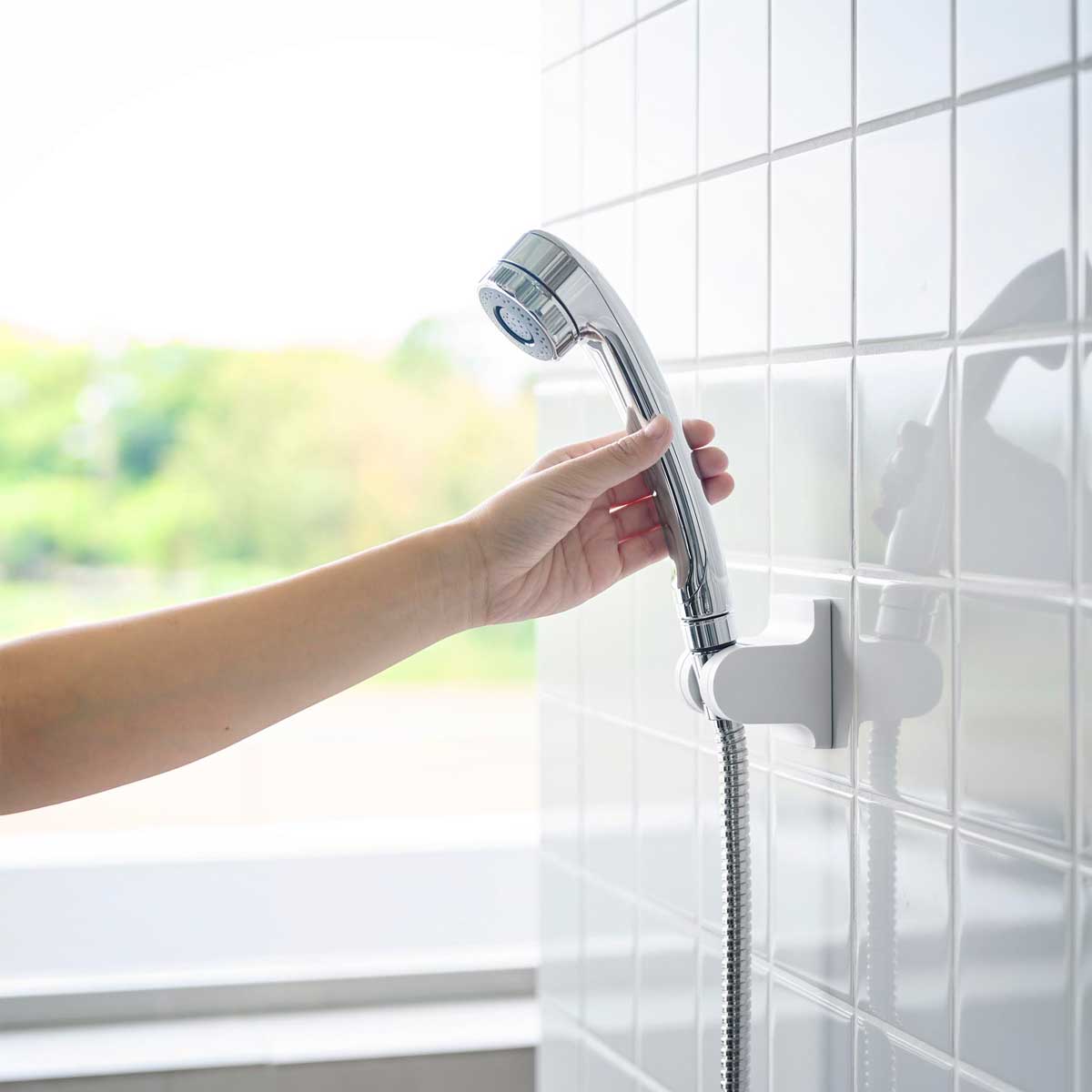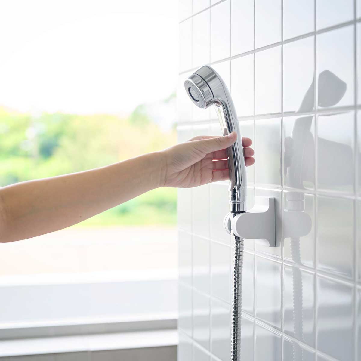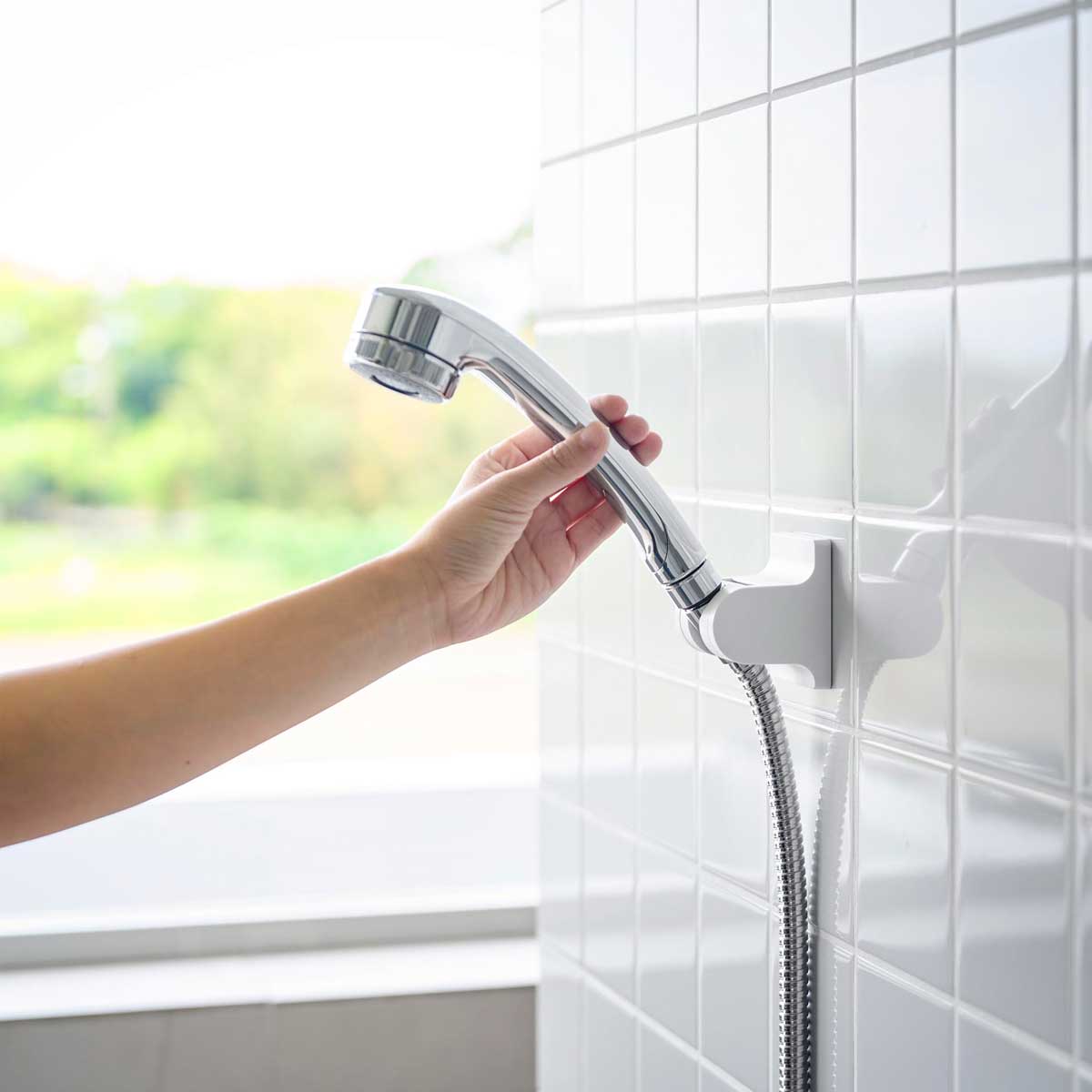 フィルムフックでお好みの位置に簡単取り付け。10度ごとに3段階の角度調節ができる便利なシャワーホルダーです。内側のストッパーで、水圧がかかってもズレにくく、使いやすい仕様です。浴槽の壁面に取り付ければ、お子様やペットのシャワーの際にも便利です。