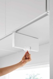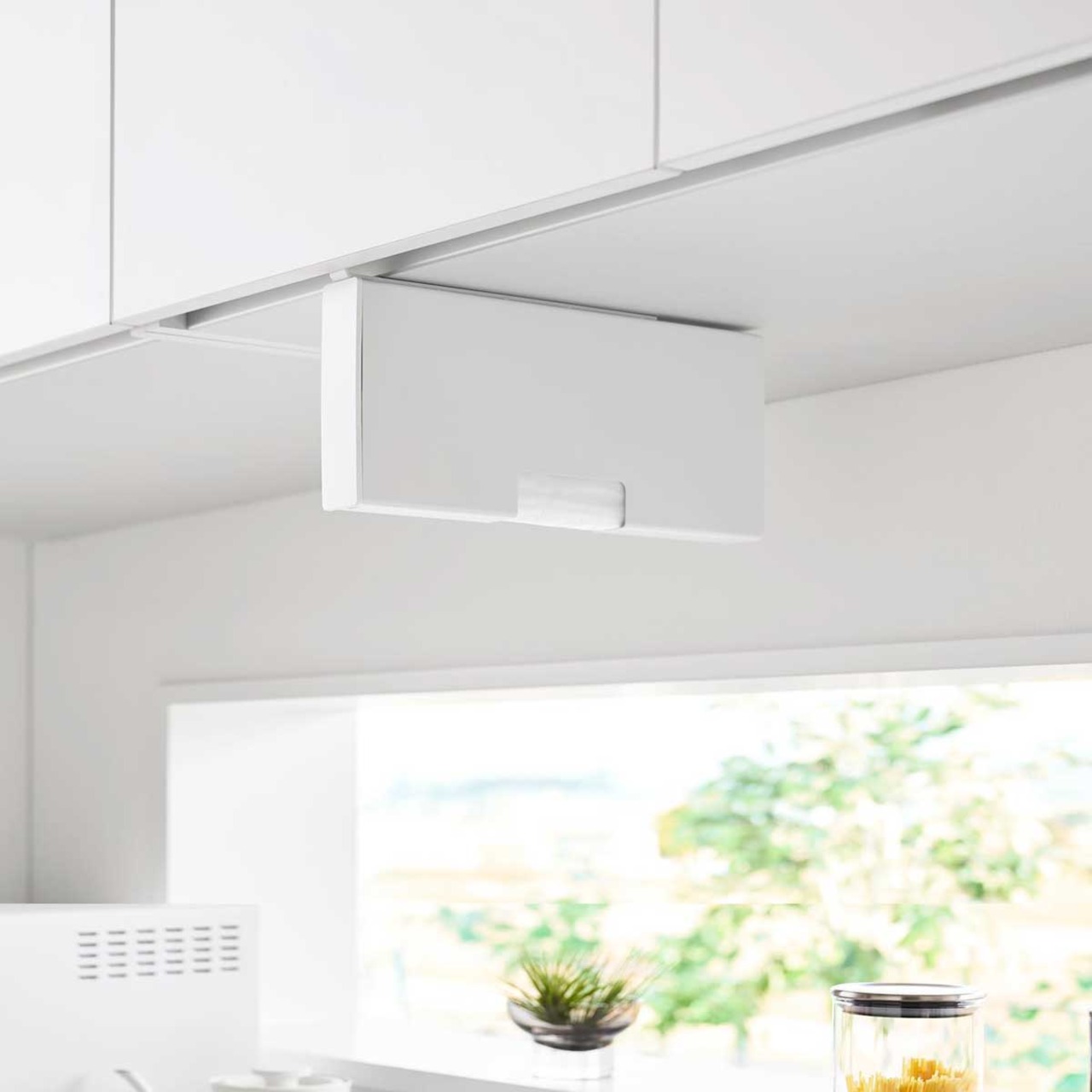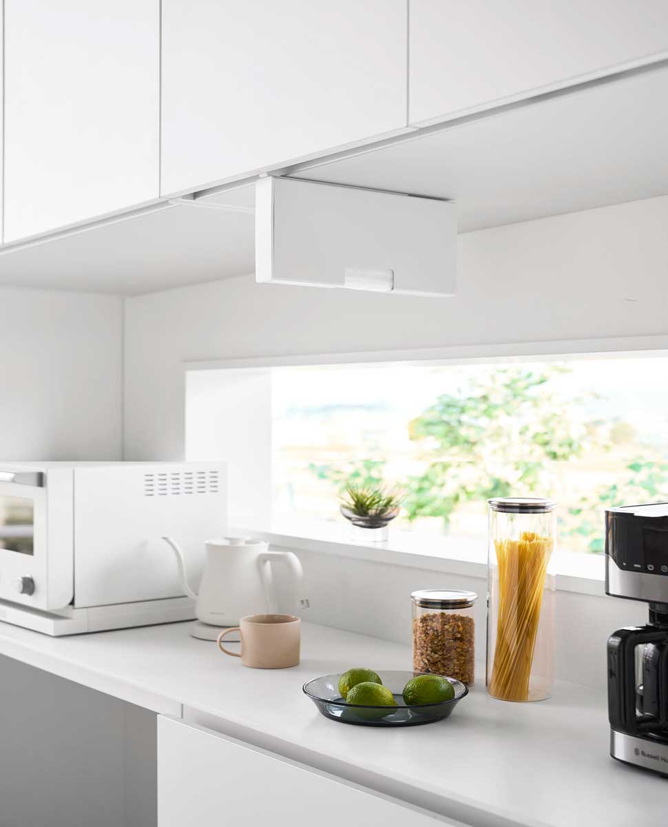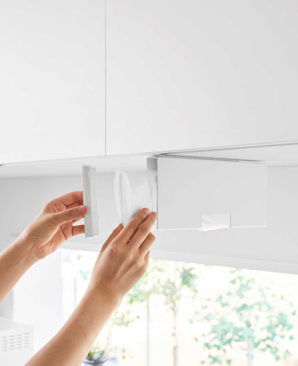 下からサッと取り出せるポリ袋収納ホルダーMサイズです。吊り下げ戸棚に差し込むだけで簡単に設置でき、蓋を開けて入れるだけで補充もスムーズ。付属の仕切り板に巻きつけることで、ポリ袋をスムーズ取り出せます。