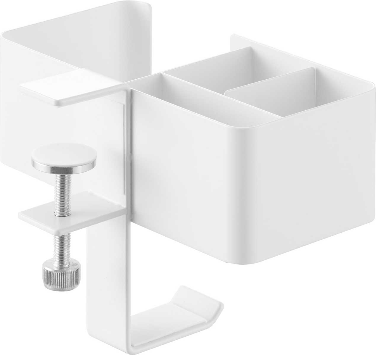テーブル横に簡単に取り付けできる、クランプ式の収納ラックです。マグカップやスマートフォンなど、置き場所に困る生活小物をまとめてスッキリ収納できます。ハンドル付きのコップも安定して置けるデザインで、シリコーン製マットがキズや転倒を防ぎます。