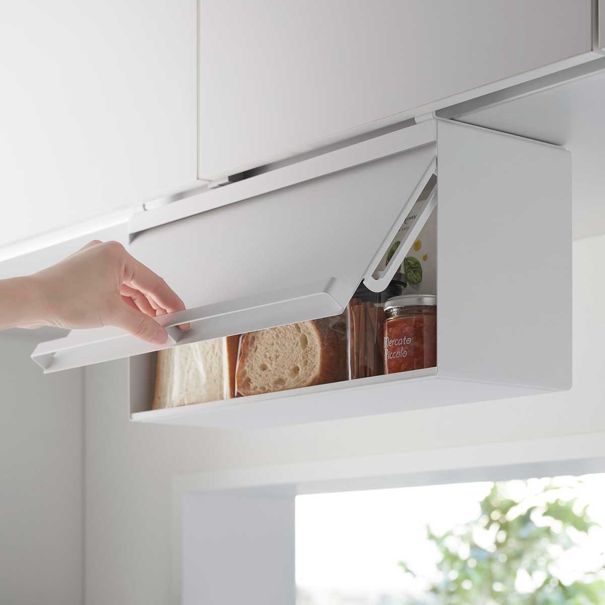 キッチンの吊り戸棚に差し込むだけで簡単に設置できる、スチール製のブレッドケースです。パンや調味料をすっきり収納でき、キッチン周りを広く使えます。扉を開けるときは持ち上げてから押し込む構造です。