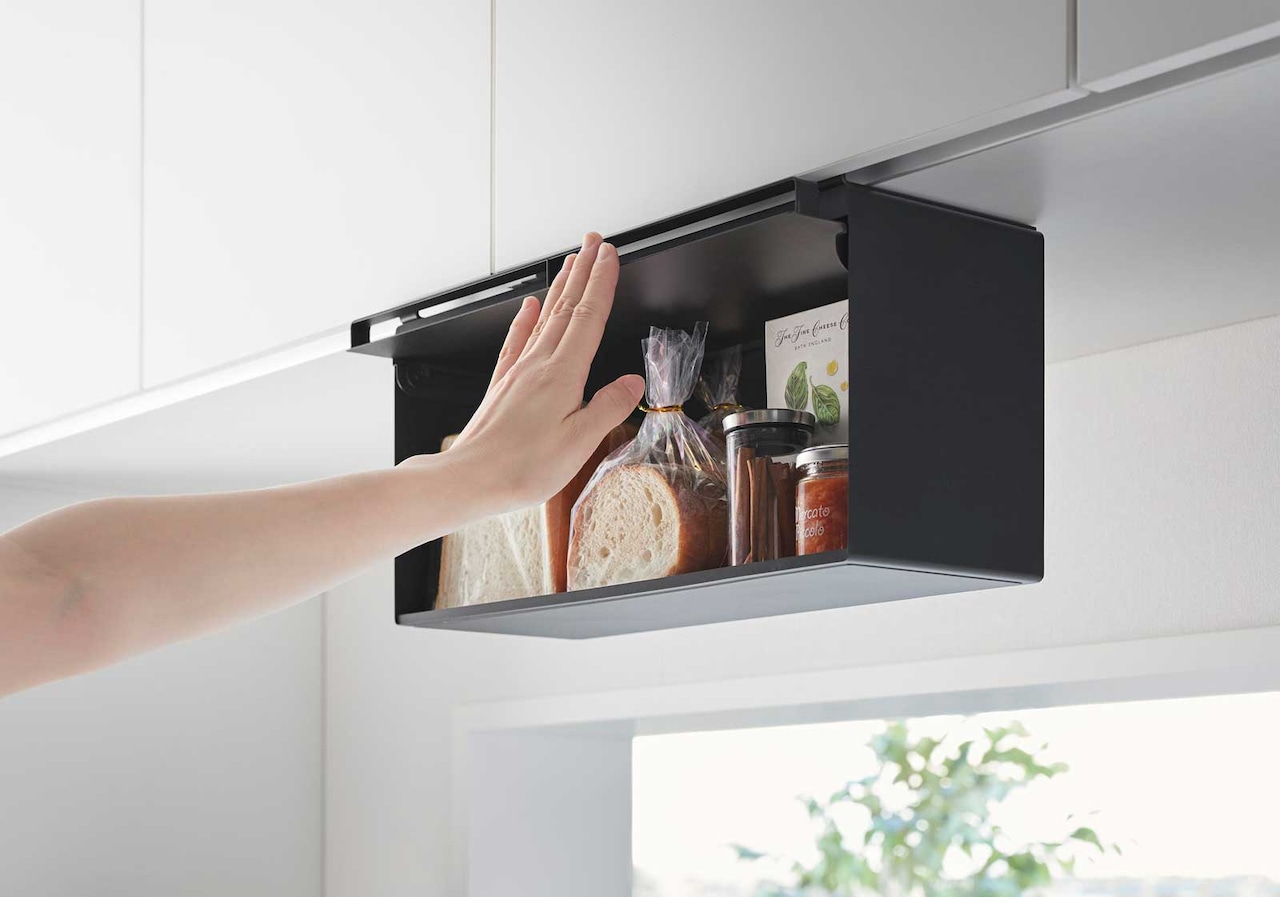 キッチンの吊り戸棚に差し込むだけで簡単に設置できる、スチール製のブレッドケースです。パンや調味料をすっきり収納でき、キッチン周りを広く使えます。扉を開けるときは持ち上げてから押し込む構造です。