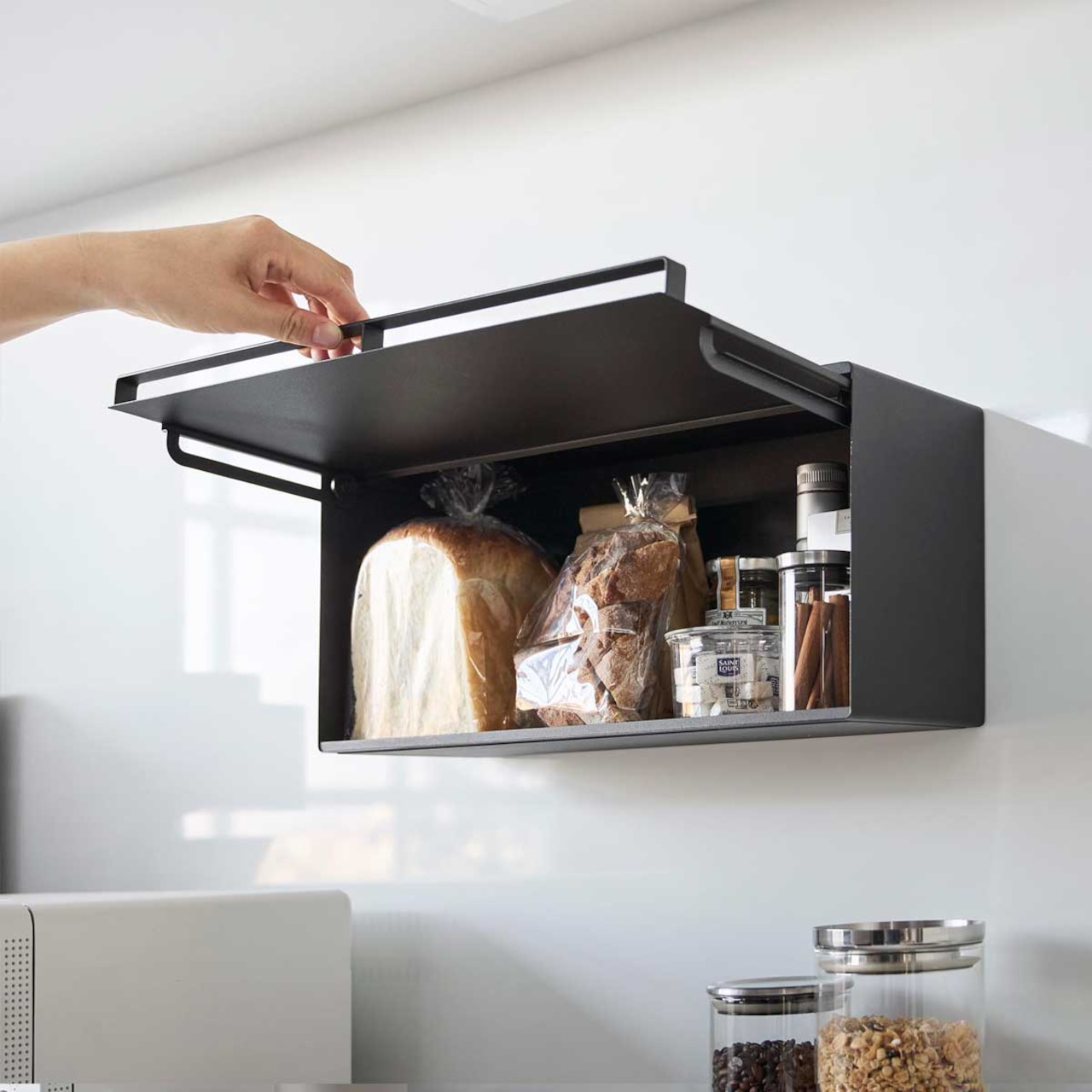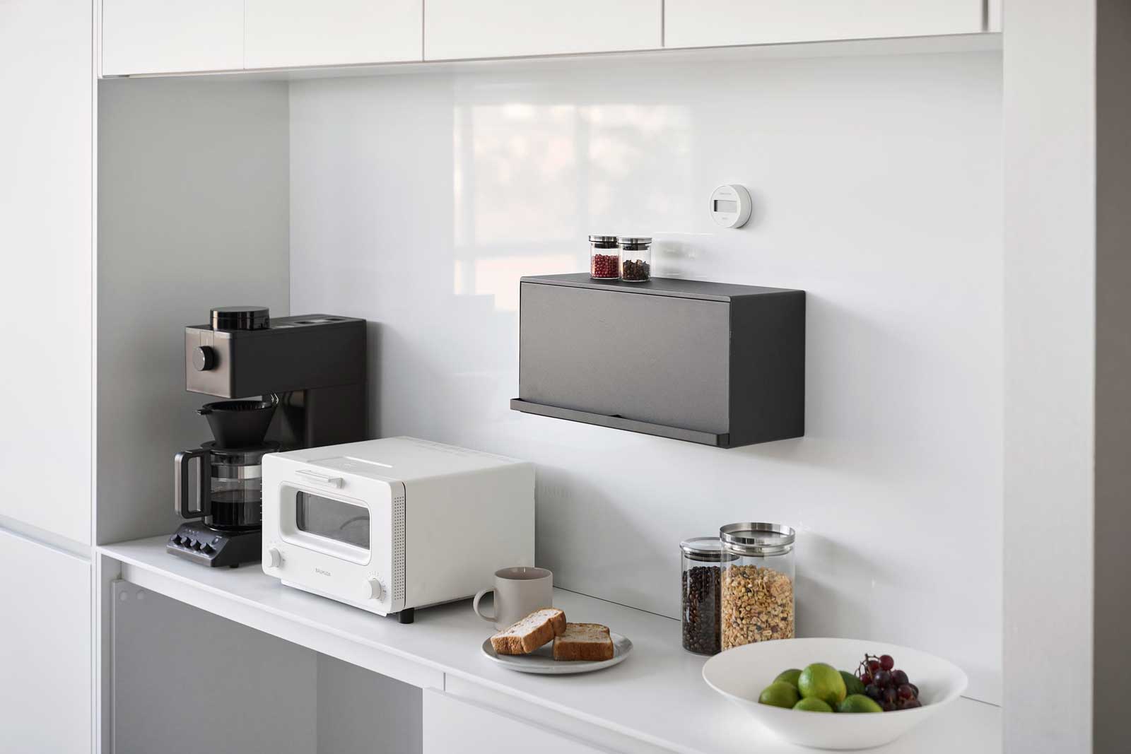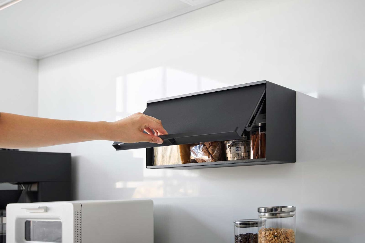 マグネットのつく壁面に簡単に設置できる、スチール製のブレッドケースです。パンや調味料をすっきり収納でき、キッチンパネルやコンロ周り、冷蔵庫などの手が届きやすい場所に設置できます。扉を開けるときは持ち上げてから押し込む構造です。