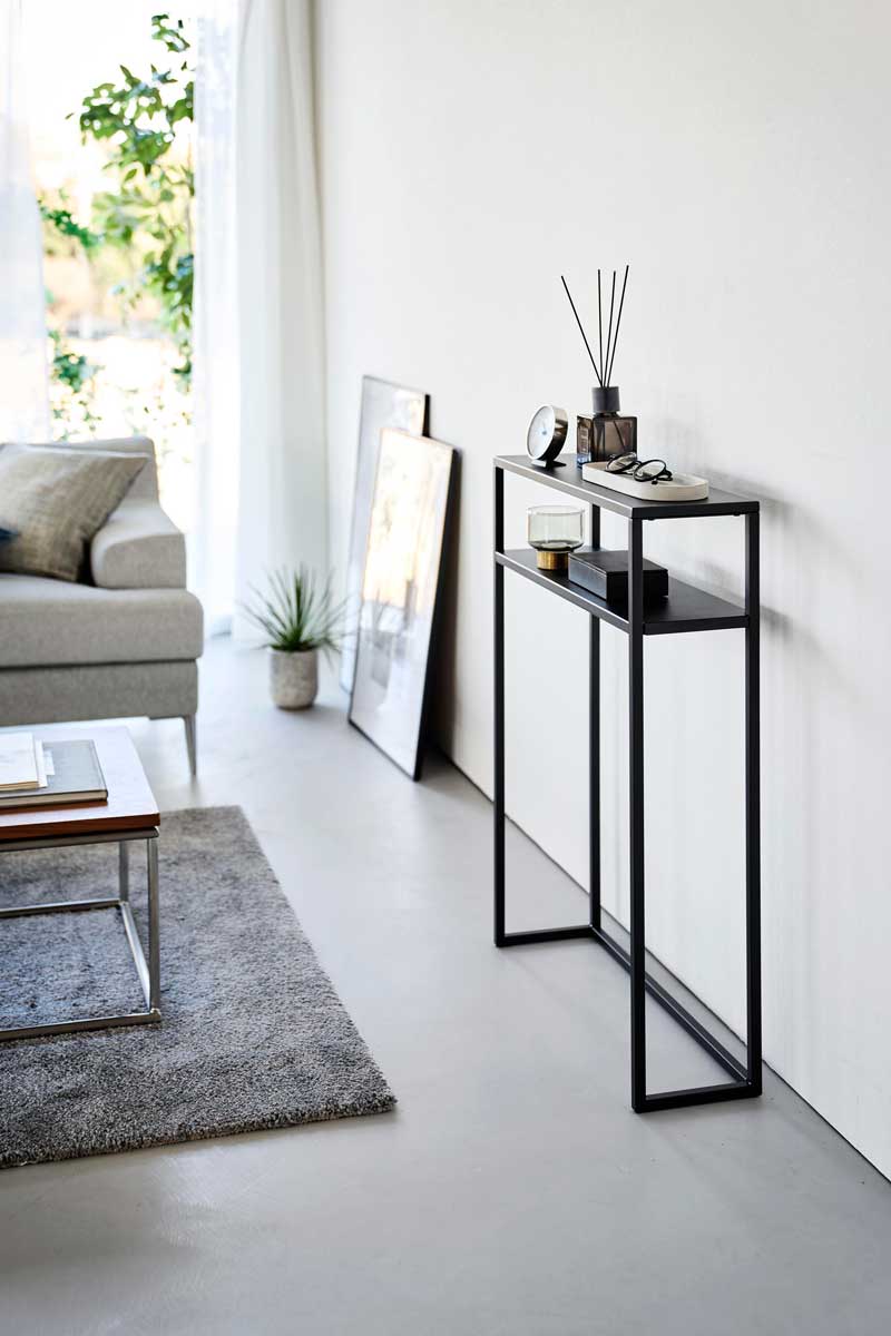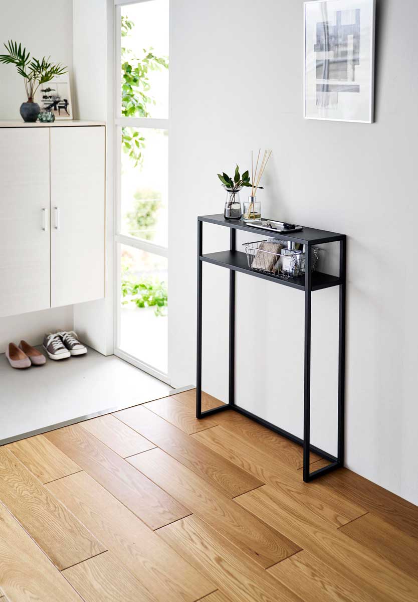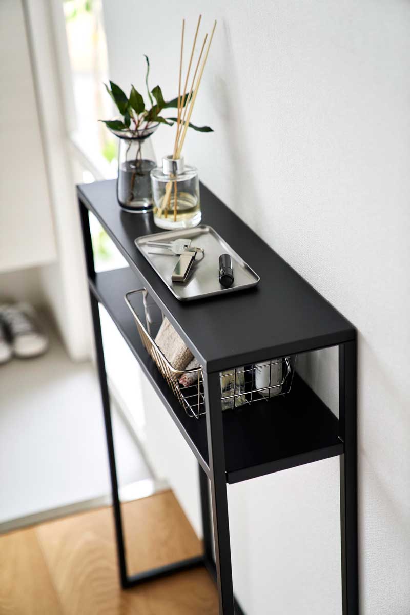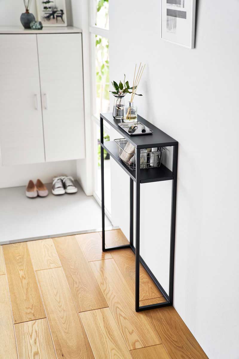 エントランスや廊下、リビングで活躍する棚付きのコンソールテーブルです。眼鏡や鍵などのちょい置きや観葉植物やディフューザーなどディスプレイに便利に使えます。一時置きにも便利なコンソールテーブルです。スチール製の本体にマグネットフックを貼り付けて、エコバッグやペットグッズなどの引っ掛け収納も可能です。