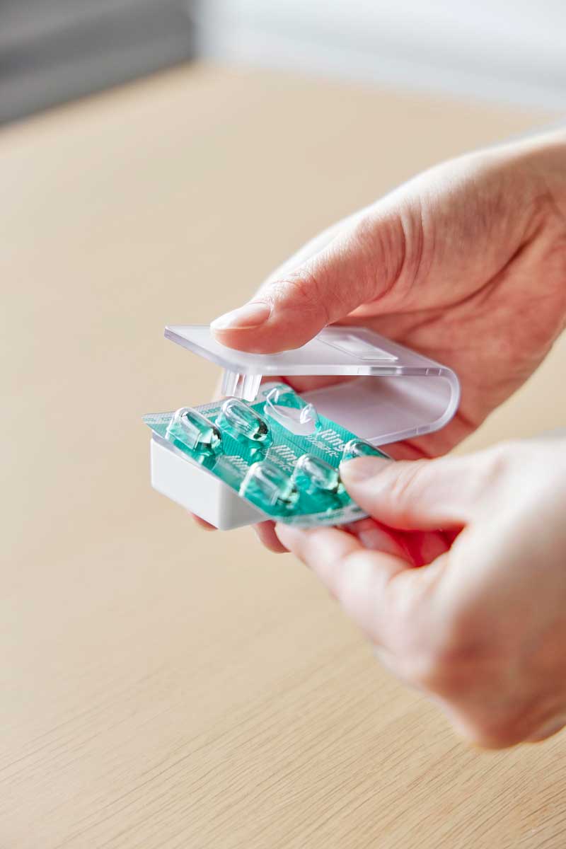 錠剤やカプセルをシートから簡単に取り出せるオープナー。シートを挟んで押すだけで簡単に錠剤を取り出せる錠剤オープナーです。錠剤は受け皿に溜まるので取り出しやすく、スライドするだけでサッと取り出せます。