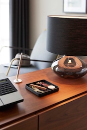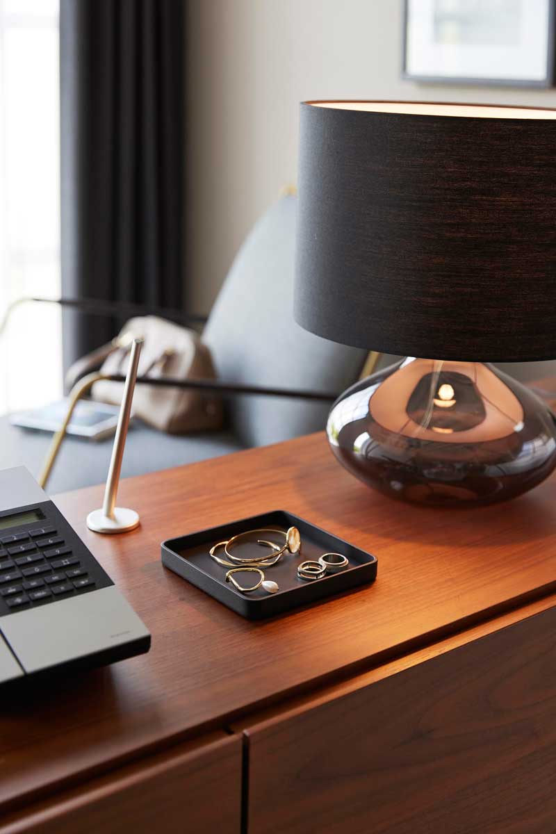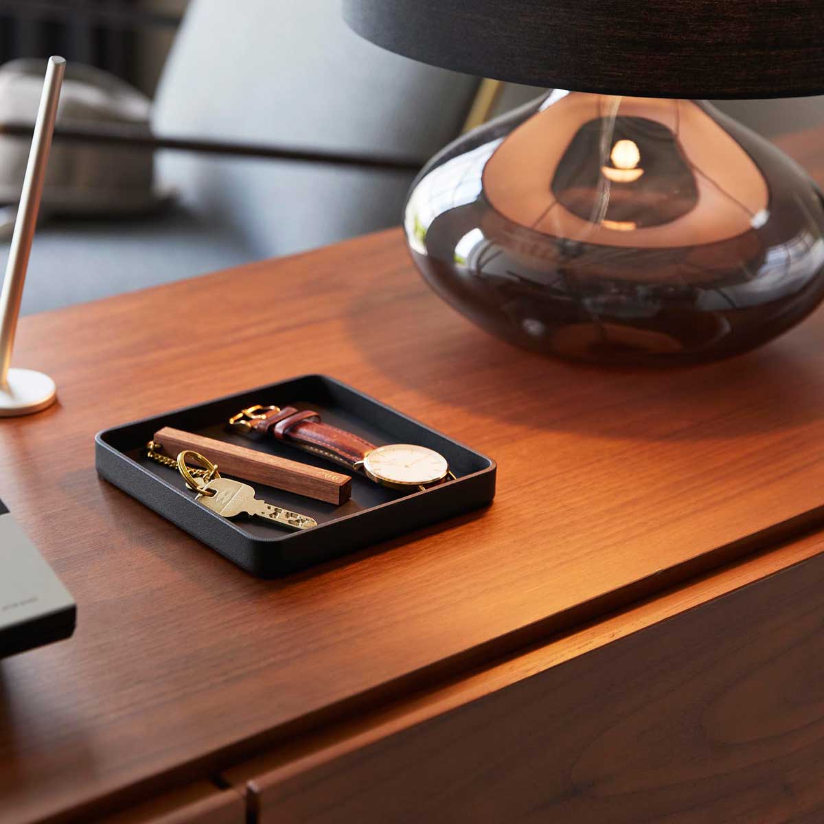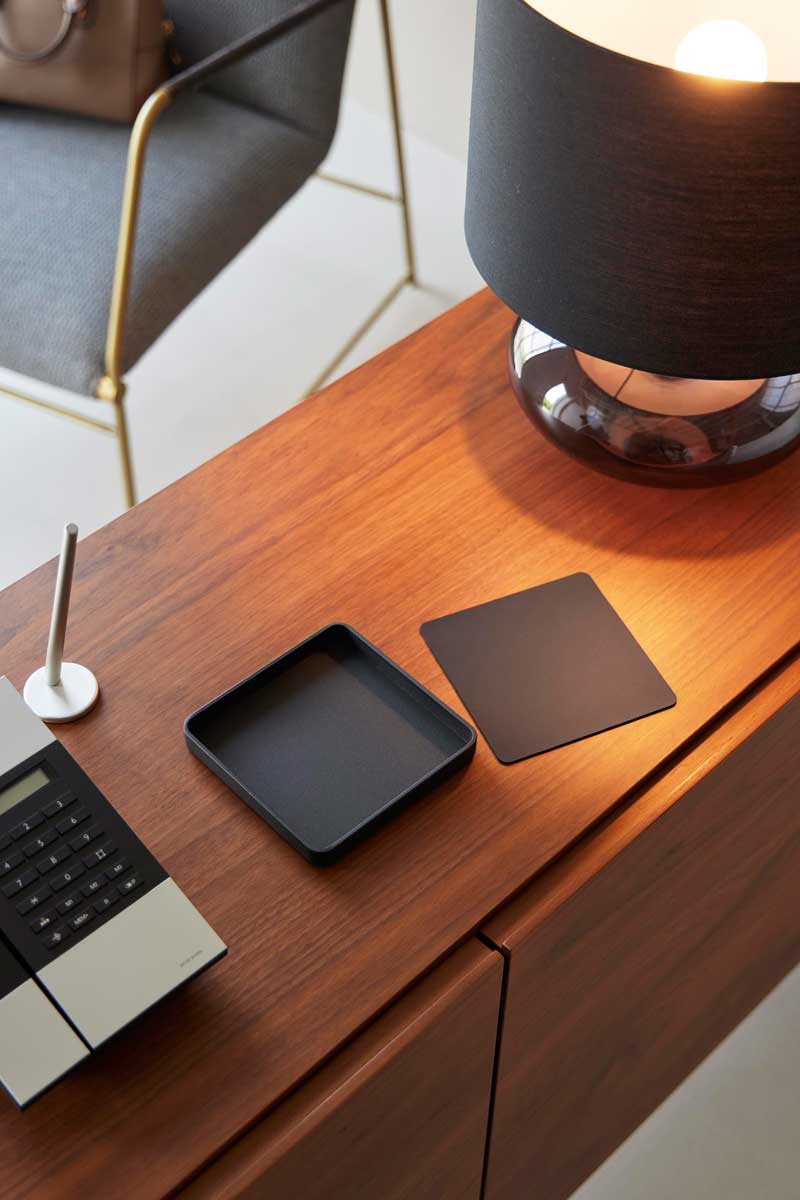 玄関や洗面台、ドレッサーなどで、普段使いのアクセサリーや時計、鍵などをサッと置ける、シンプルで上質なスチール製トレーです。梨地加工を施した重厚感のあるトレーで、小物のキズつき防止のためのシリコーンマットが付いています。