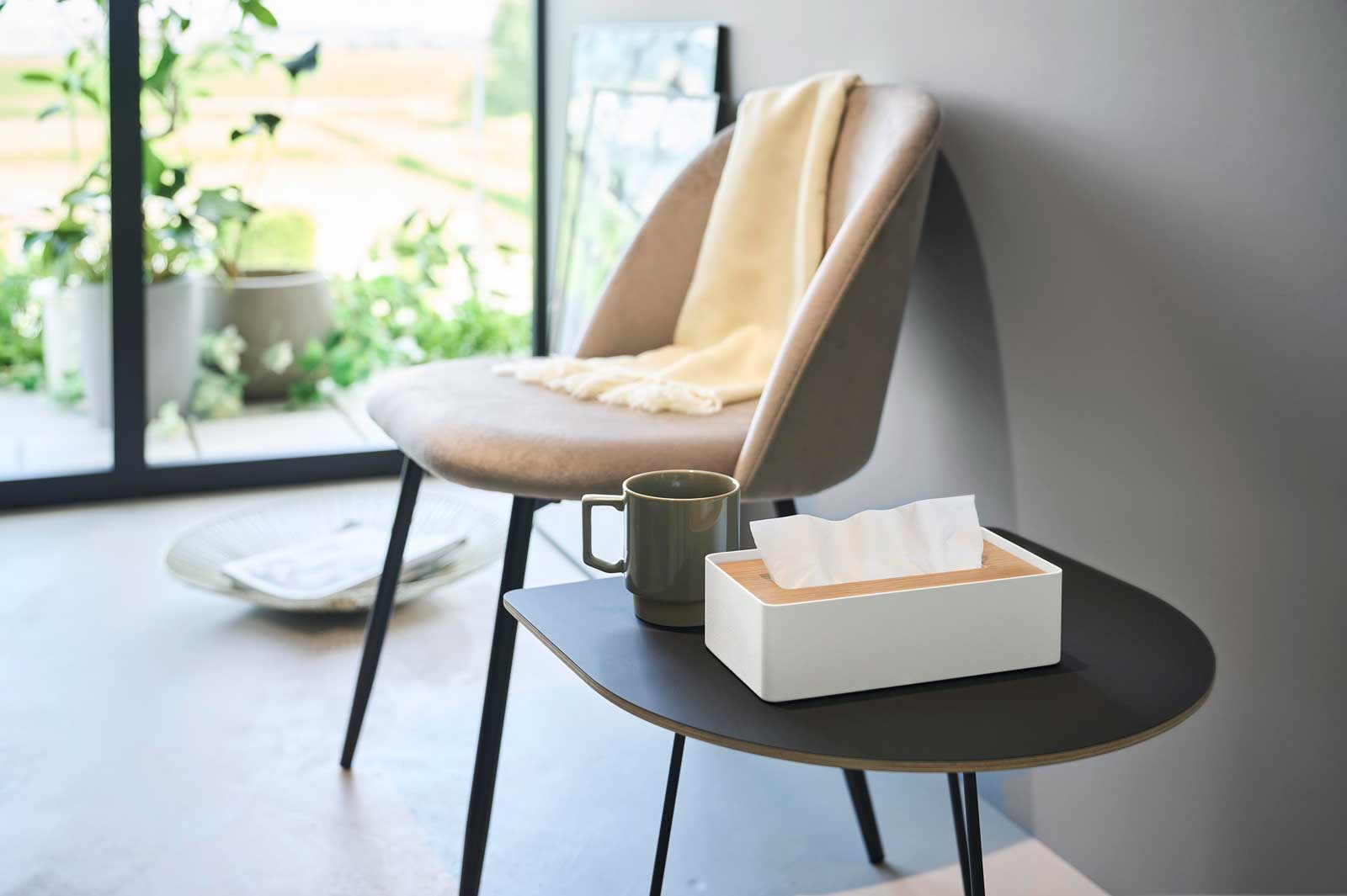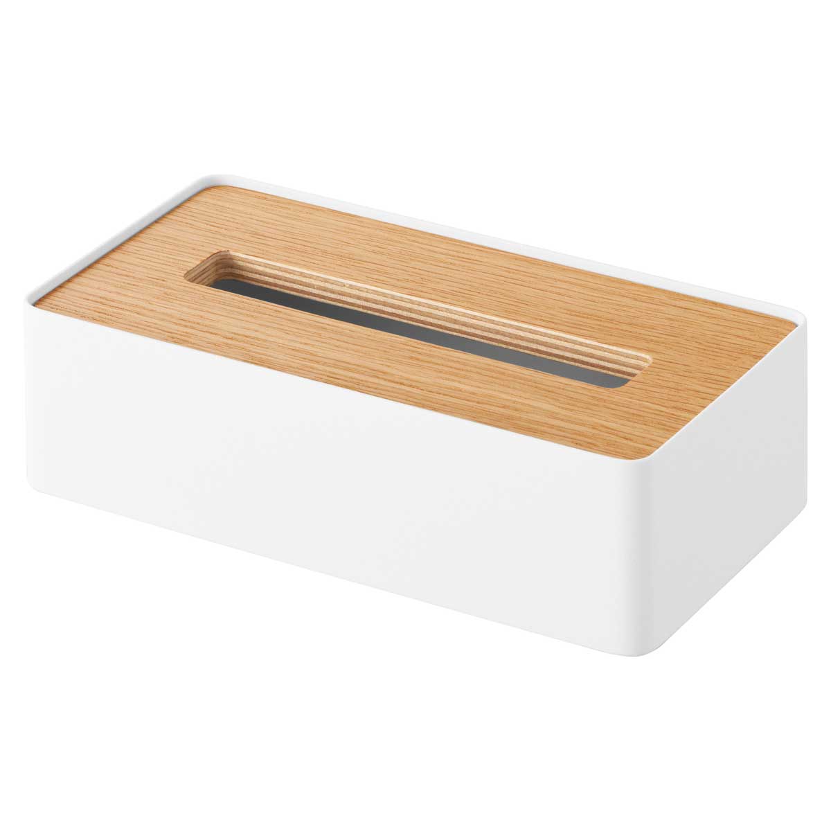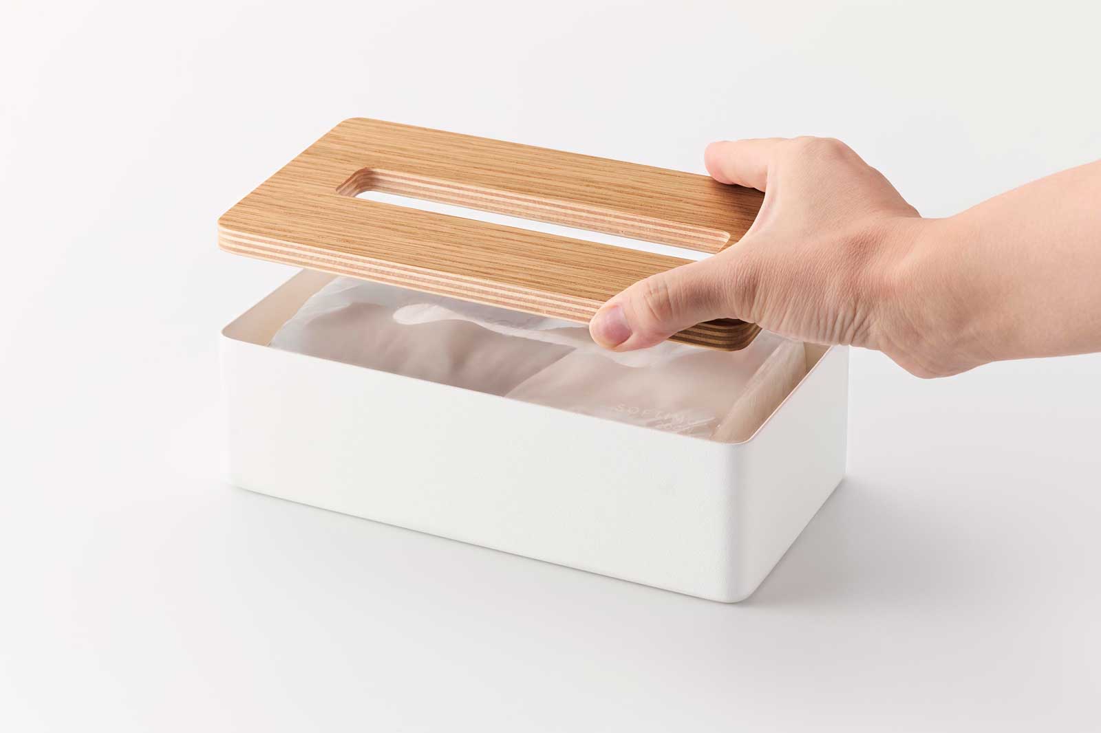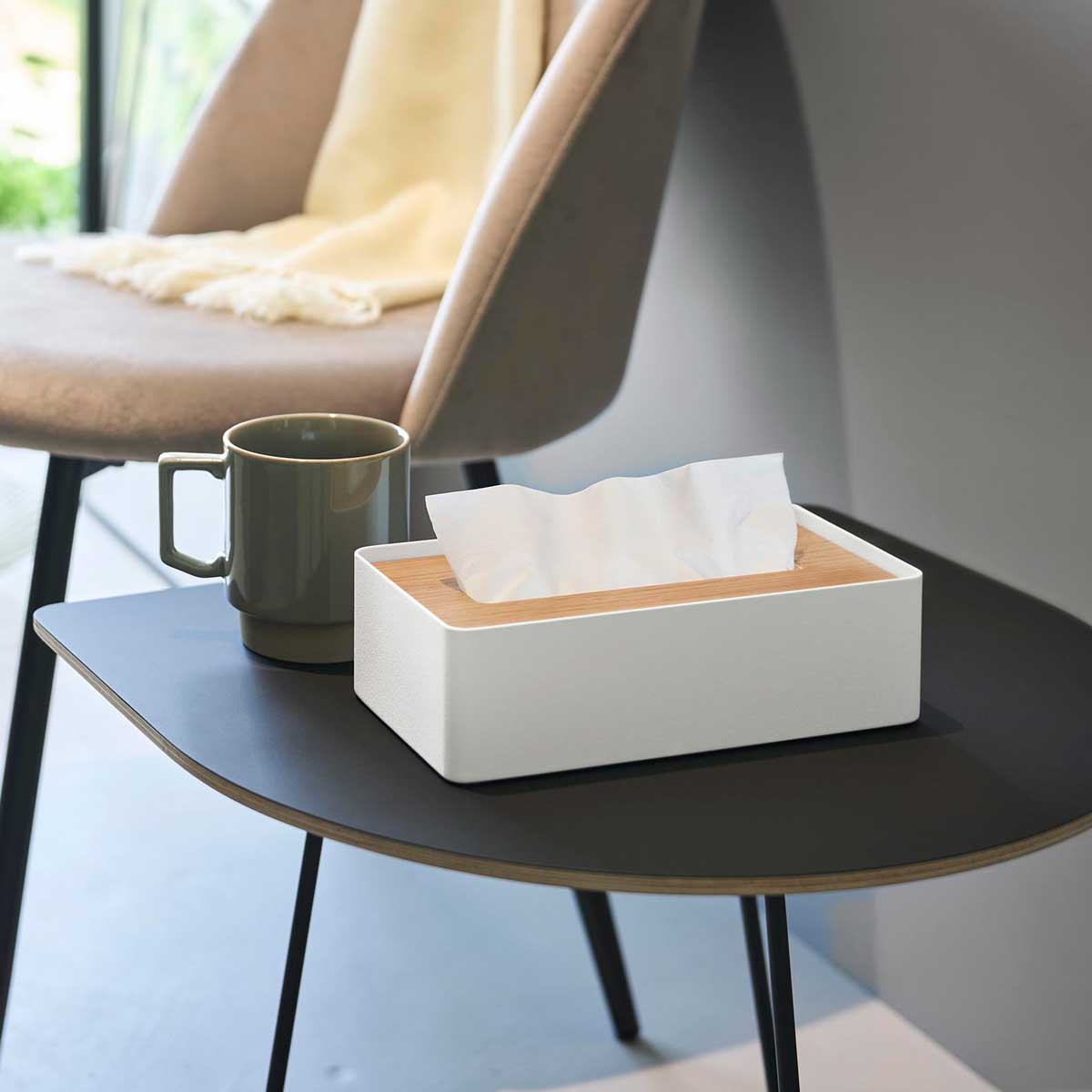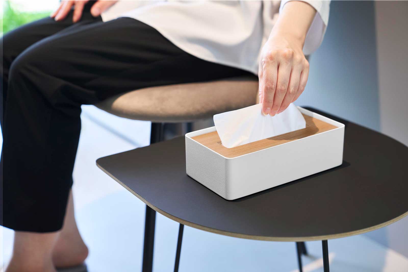 木とスチールの組み合わせが美しい、蓋付きのコンパクトティッシュケースです。150組(300枚)までのソフトパックティッシュに対応しています。コンパクトなサイズ感で場所を取らず、上質なデザインがさまざまな空間に自然と馴染みます。