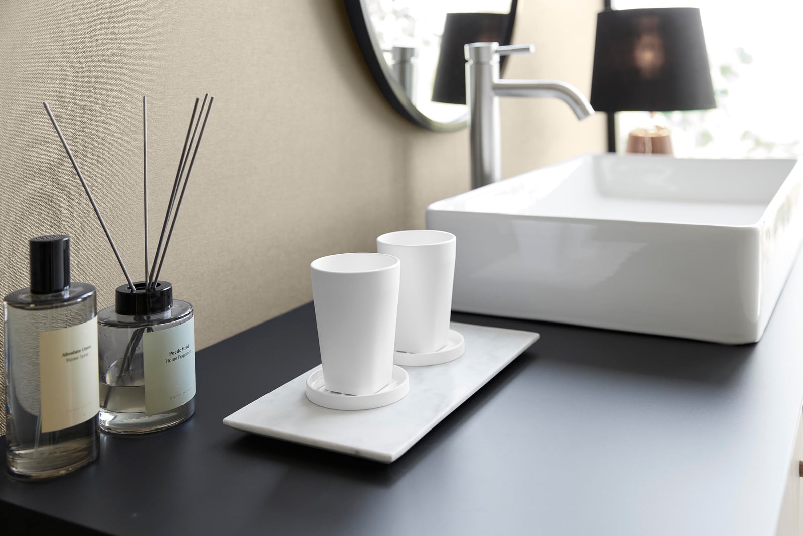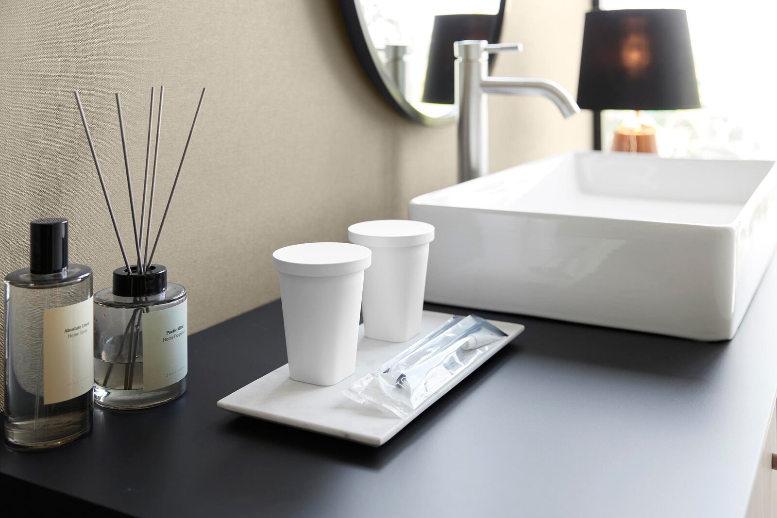 洗面所のアメニティとしてはもちろん、ご自宅でもお使いいただけます。人体に影響する可能性が示唆される化学物質(BPA)を含まず、強度、透明度、耐熱性があるイーストマン Tritanやトライタンを使用している安全な製品です。