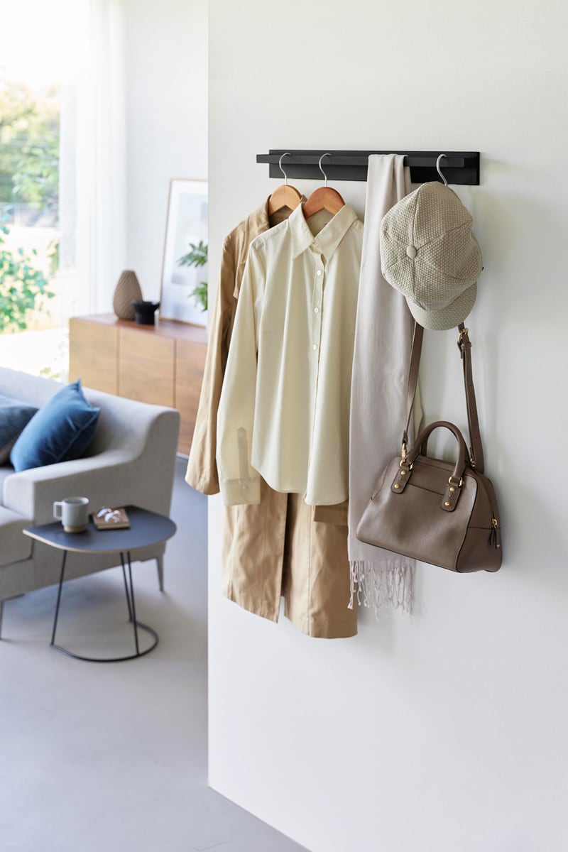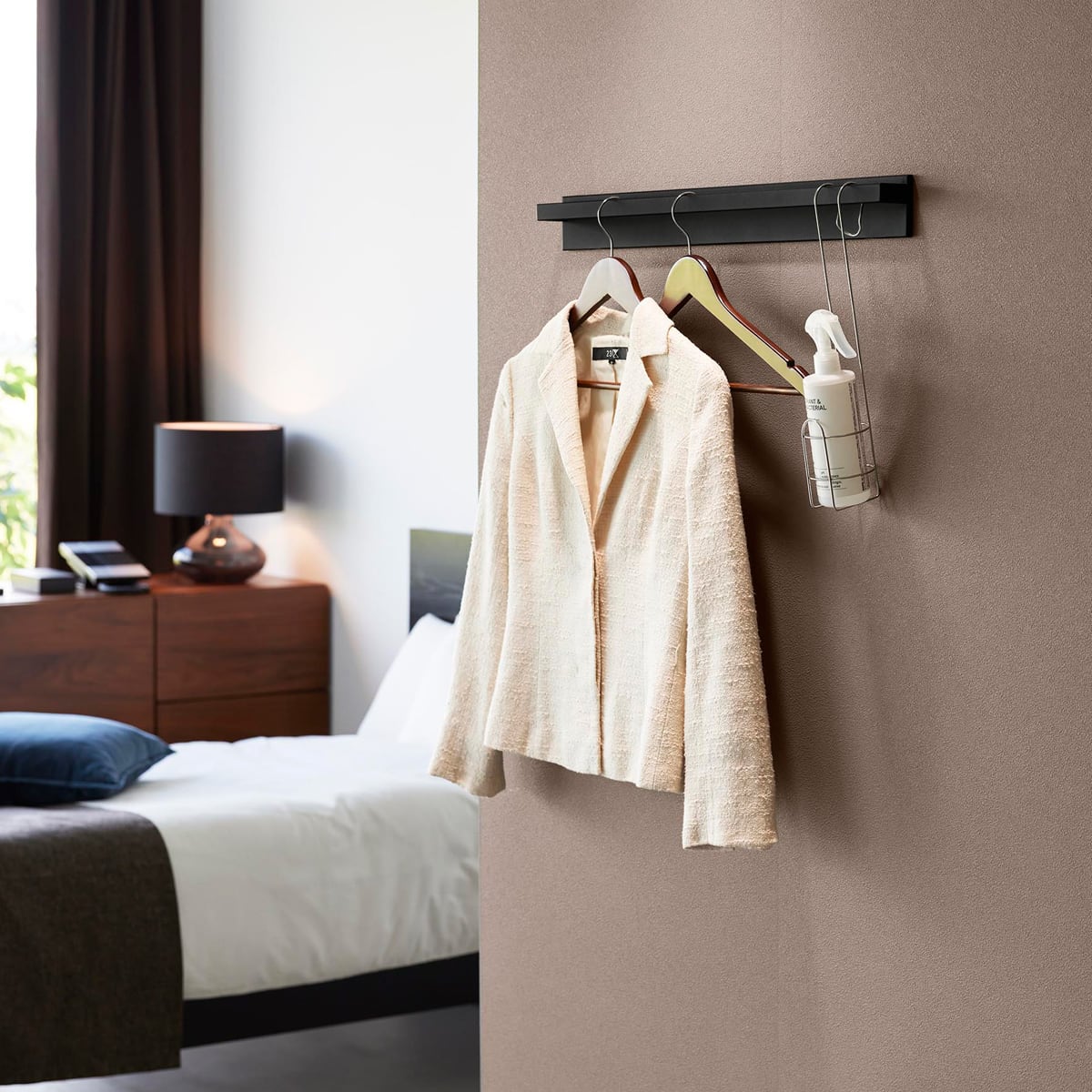 ジャケットや帽子、ストールなどのアイテムと一緒にファブリックスプレーのボトルも引っ掛けられる幅60cmのワイド設計です。帰宅後にジャケットを一時掛けしたり、お出掛けに必要なものをあらかじめまとめたりと便利に使えます。