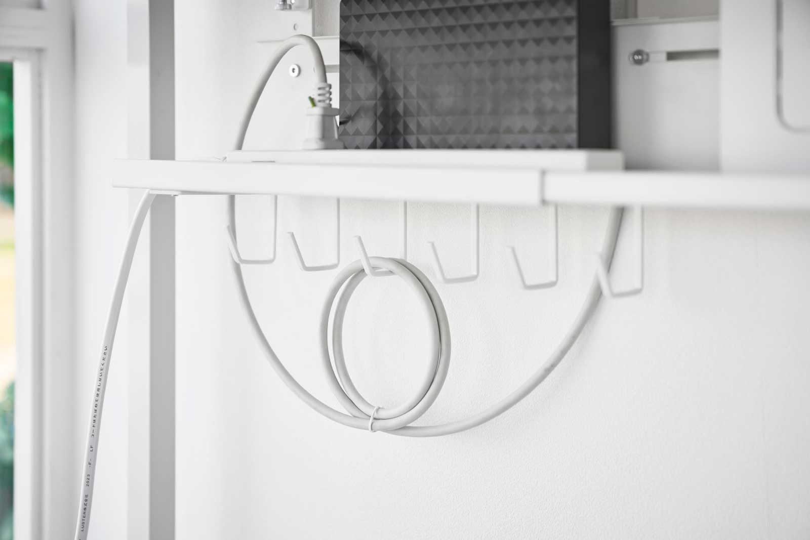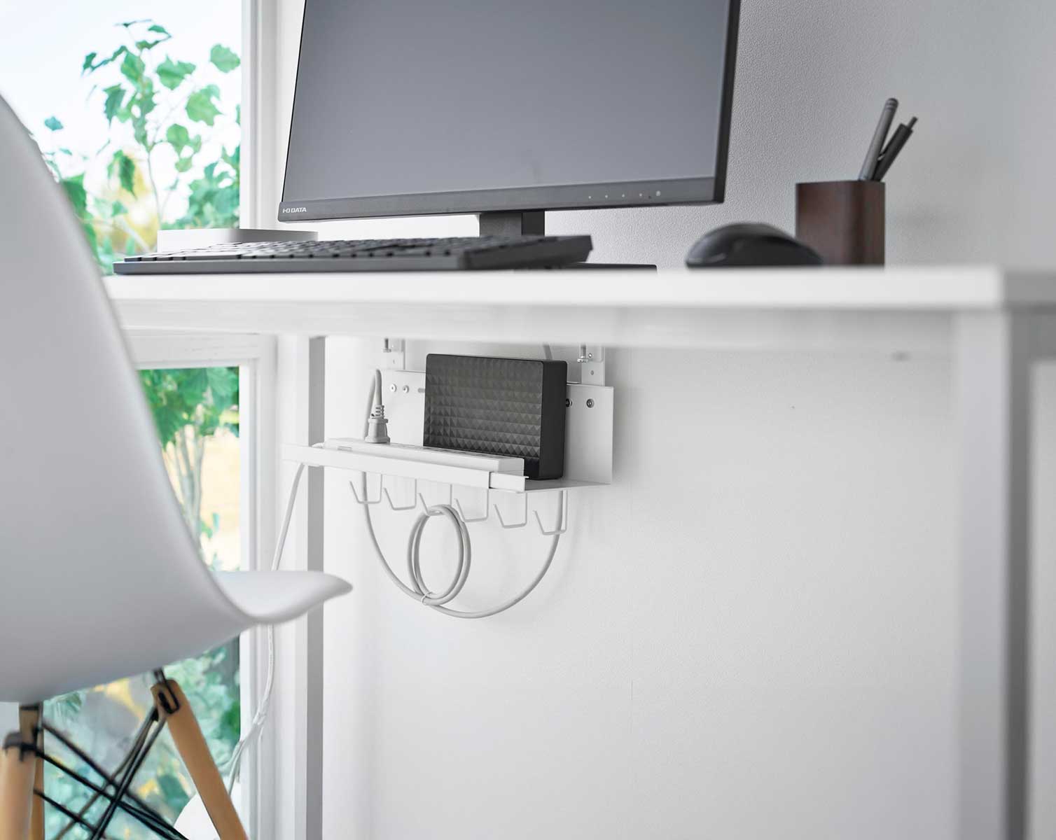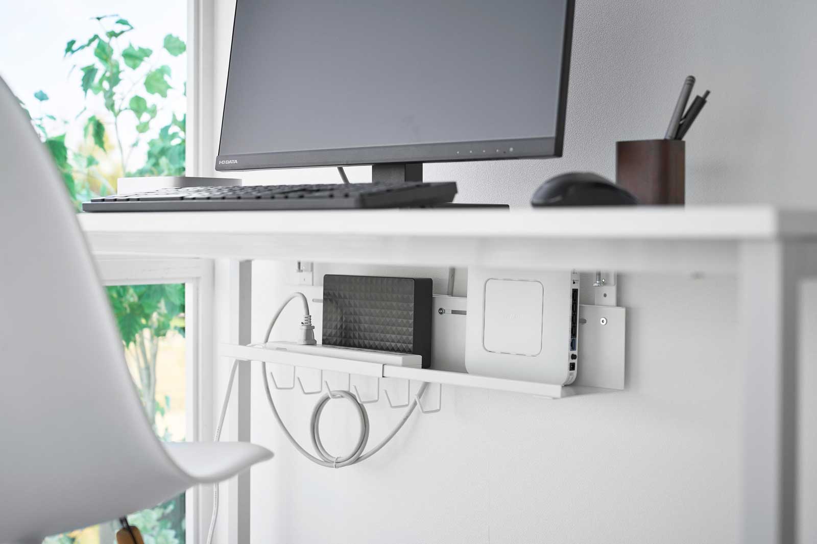 本体設置後でもデスク天板と本体トレーの間にはゆとりがあるため、ハードディスクやルーターのセッティングがスムーズ!余ったケーブルを束ねて整理できる便利なフック付き。床にケーブルが散乱しないので、掃除もラクラクです。