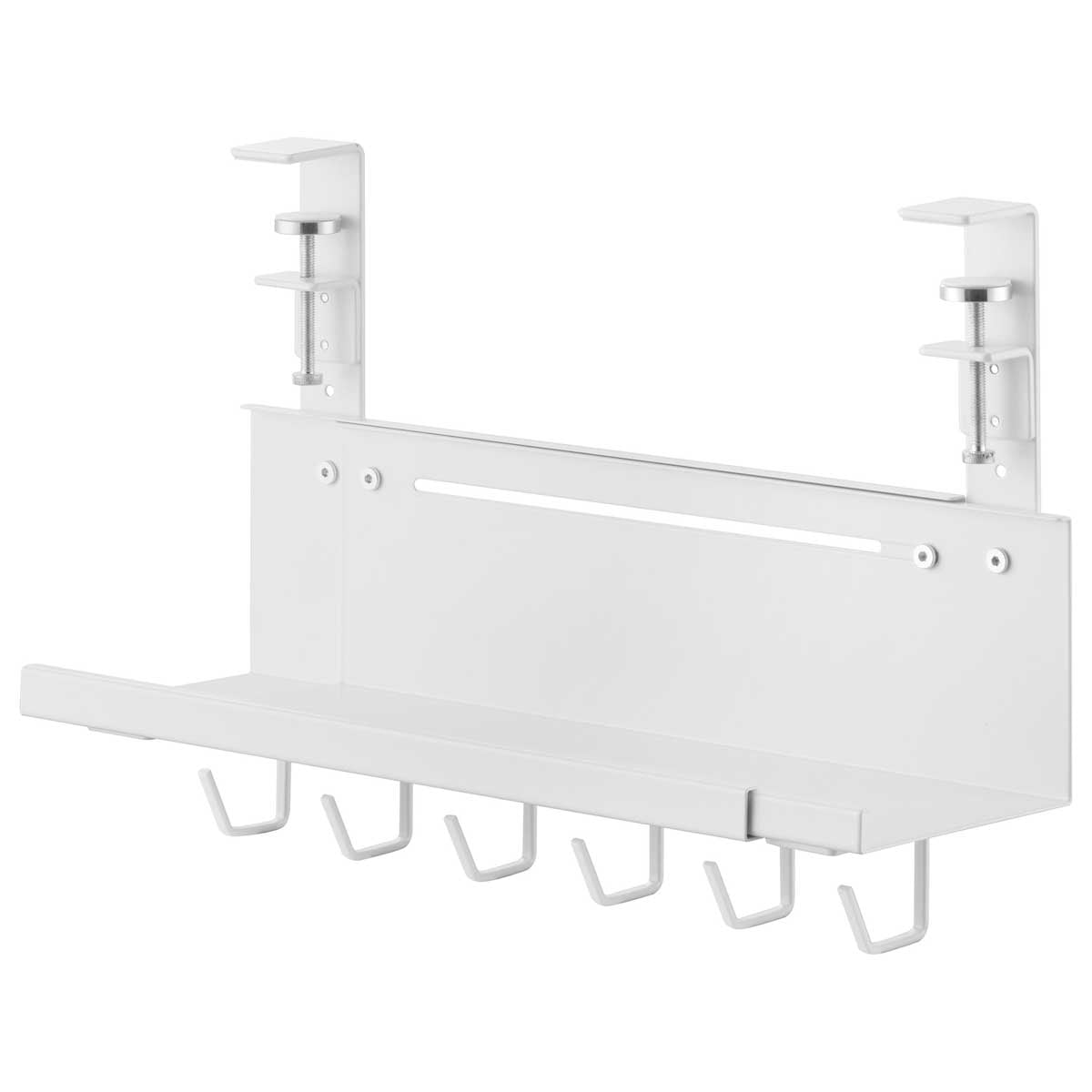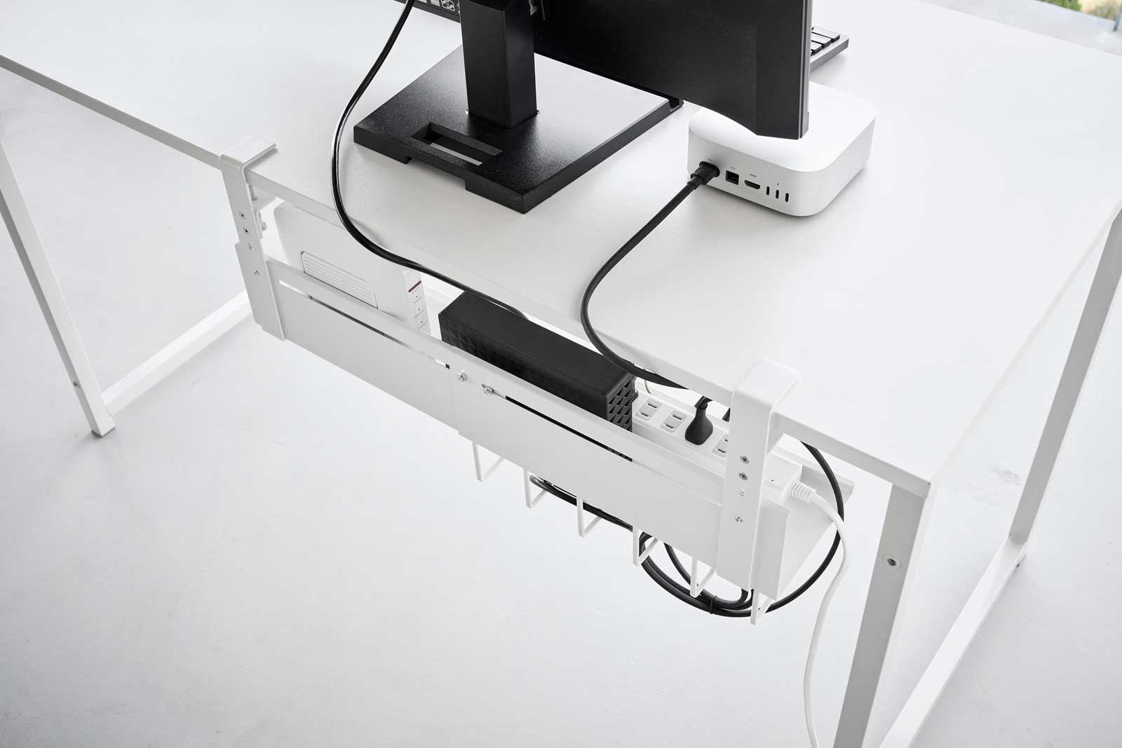 幅37-60cmに伸縮するデスク下収納トレーです。クランプ式のネジでしっかりと固定でき、厚み5.5cmまでの天板に対応しています。散らかりがちなケーブルやタップ類を浮かせて収納できるので、デスク下がスッキリ片付きます。