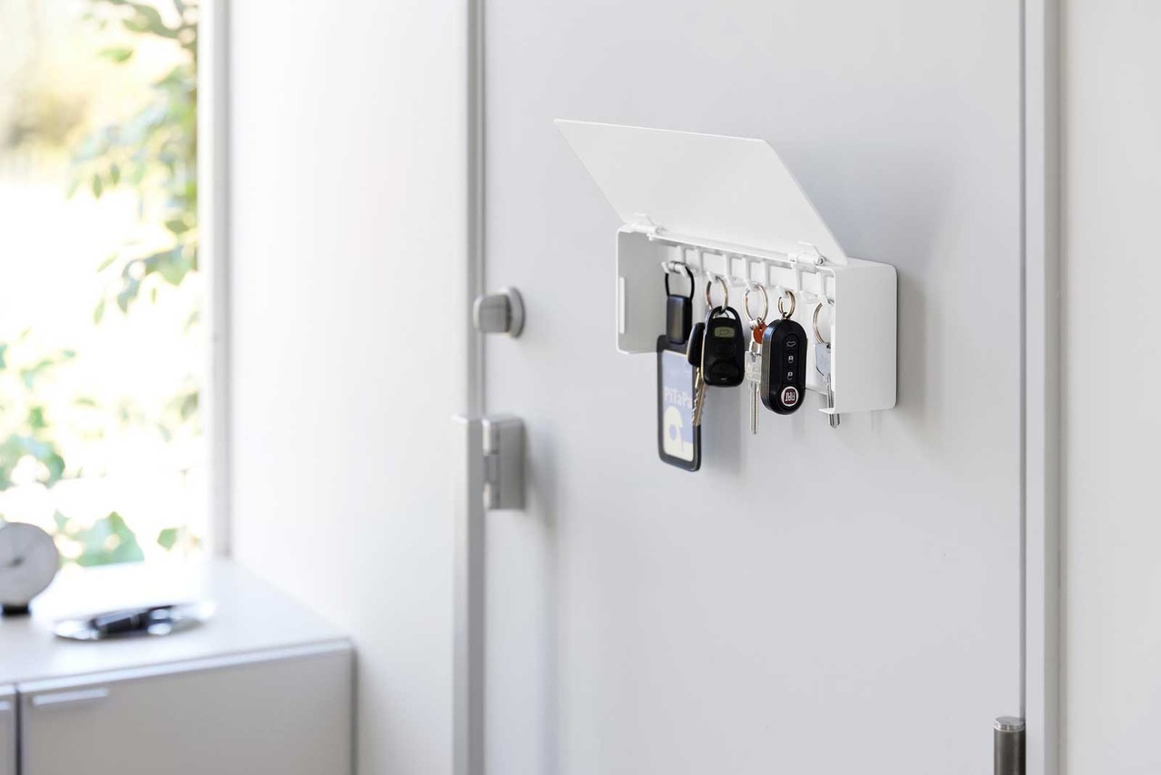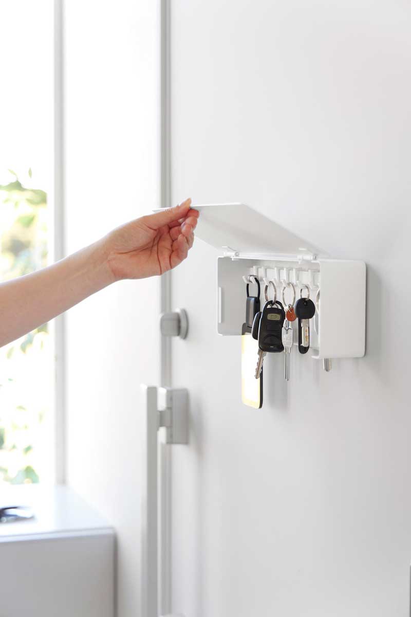 スリムな奥行きで玄関ドアに貼り付けても場所を取らず、すっきり設置できます。本体下があいているので、鍵の長さを気にせず収納可能で、キーケースやICカードケースも掛けられて便利です。