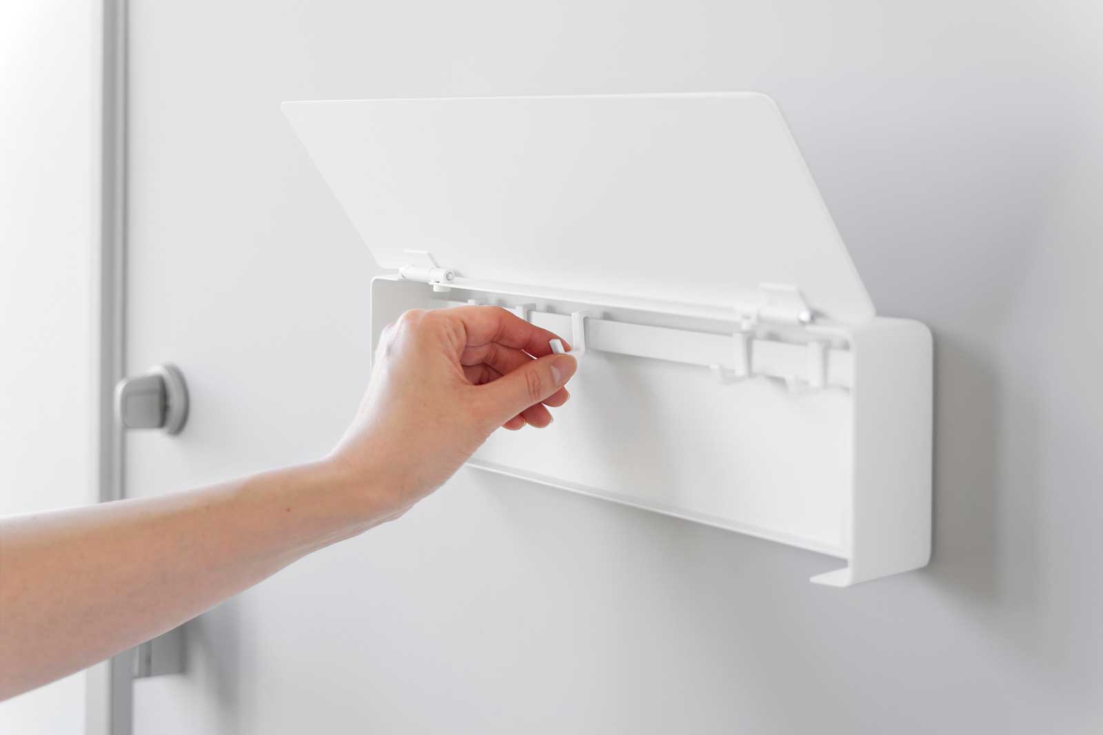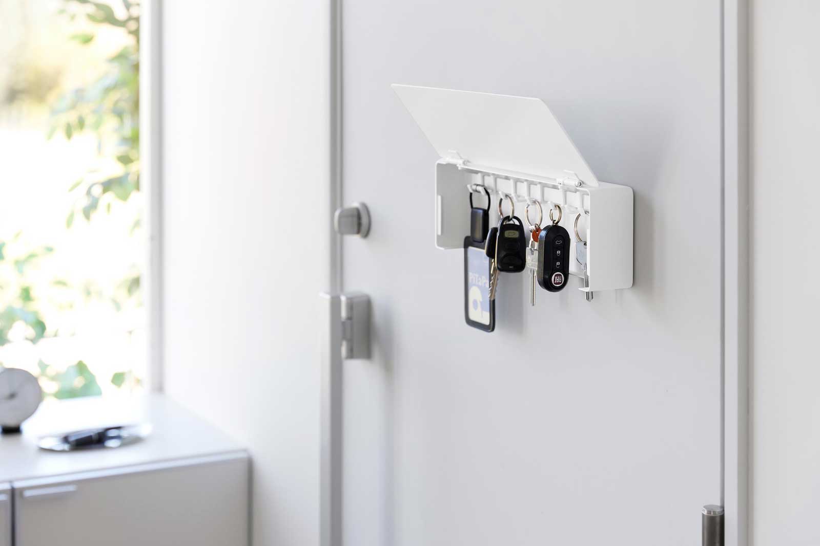 可動式フックが8個付属しており、お好みの位置に調整して取り付け。スチール製の本体にはマグネット小物なども取り付け可能。また、扉は片手で簡単に開閉でき、開いた状態をキープできるため、鍵の出し入れもスムーズ。