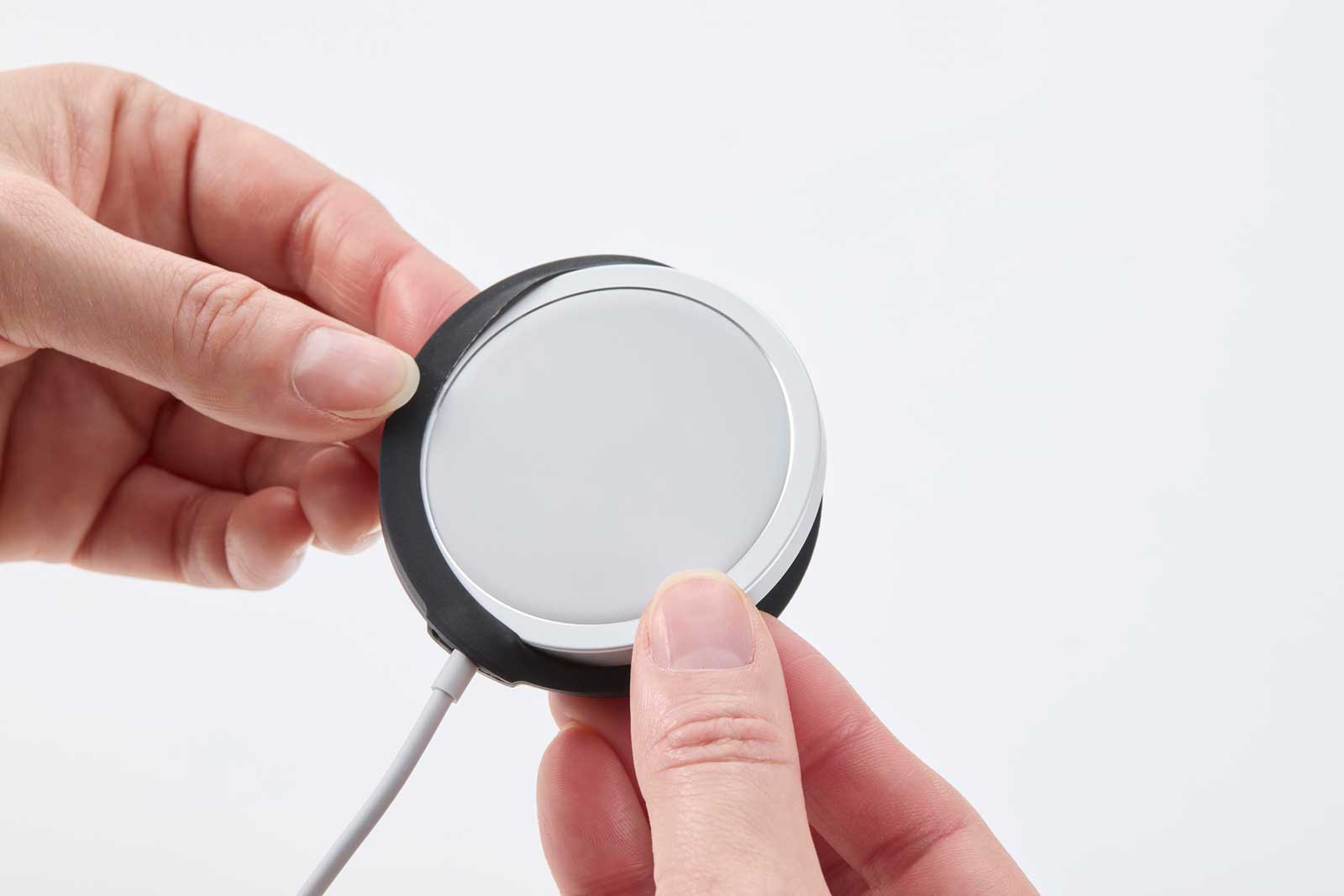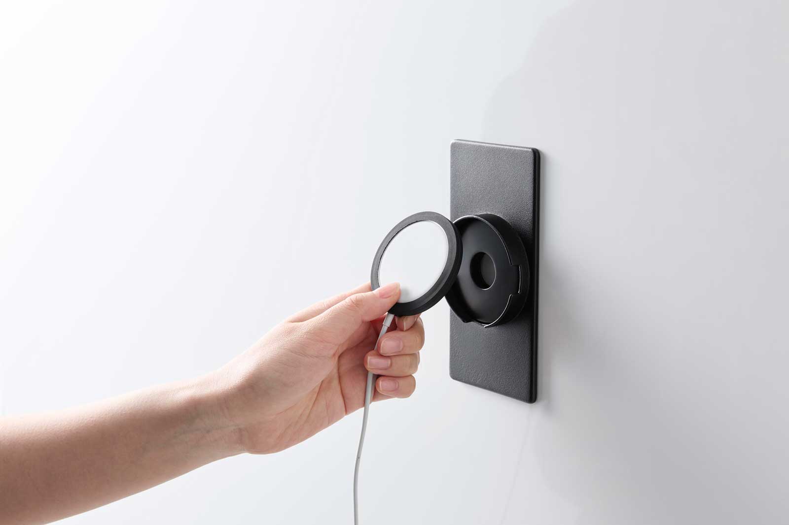 お手持ちのマグネット式ワイヤレス充電器をホルダー部にはめ込み、磁力でスマートフォンを取り付けるだけで充電でき、ハンズフリーでの操作が可能です。