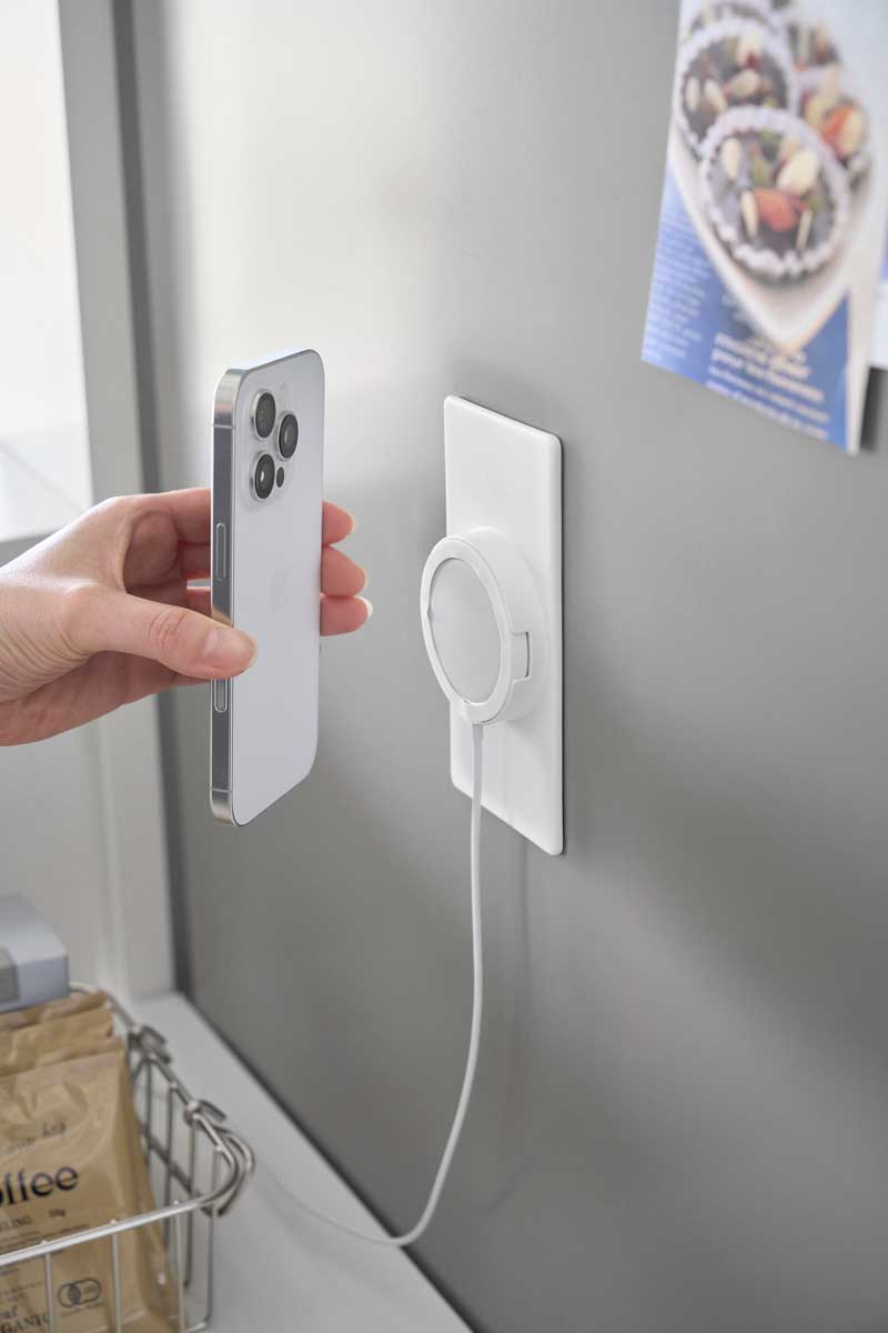 お手持ちのマグネット式ワイヤレス充電器をホルダー部にはめ込み、磁力でスマートフォンを取り付けるだけで充電でき、ハンズフリーでの操作が可能です。