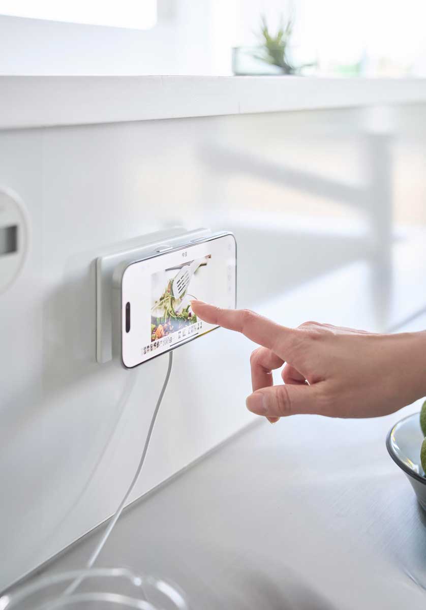 マグネット式ワイヤレス充電器対応のスマートフォンホルダー。マグネットがつくスチール面に簡単に設置できる、スチール製のスマートフォンホルダーです。