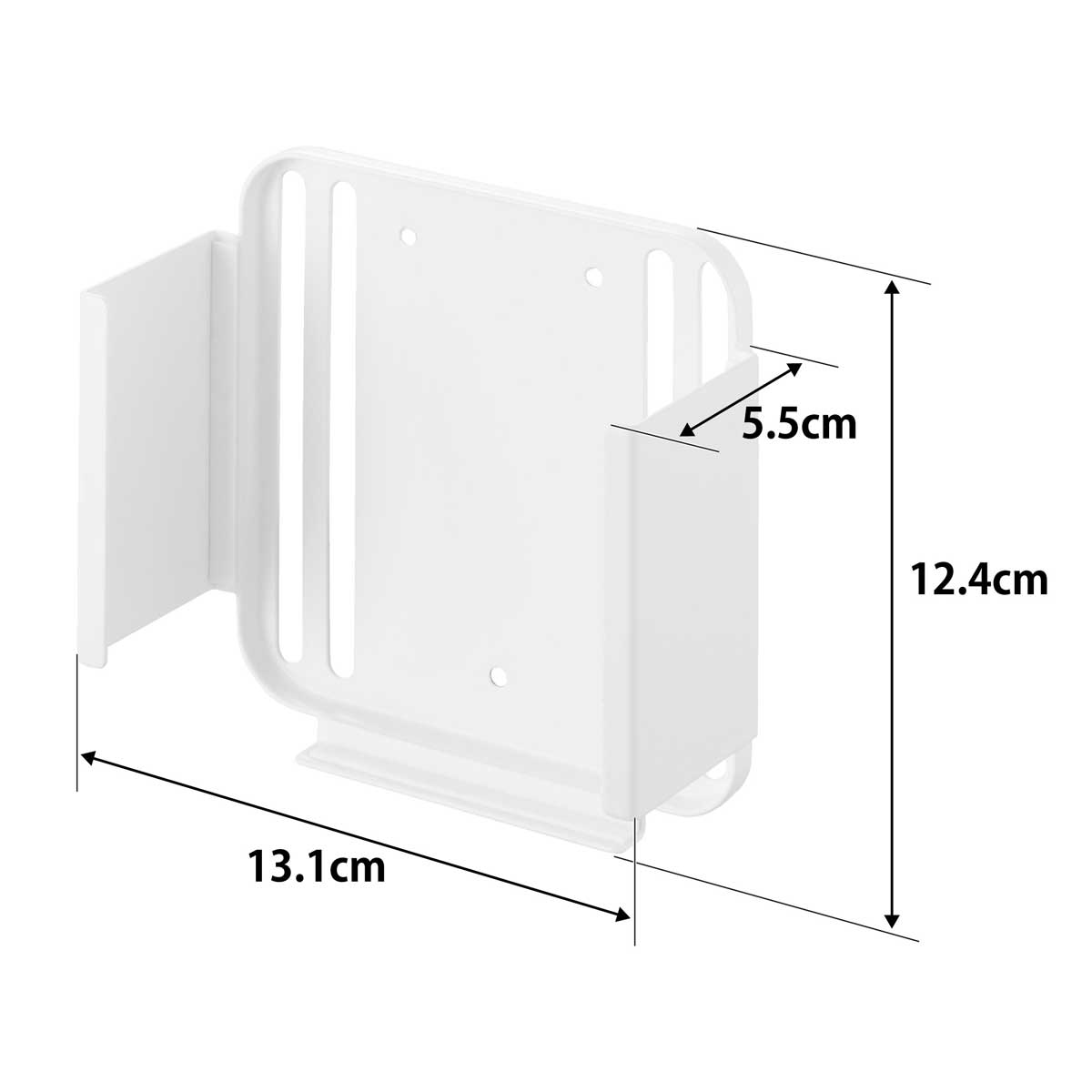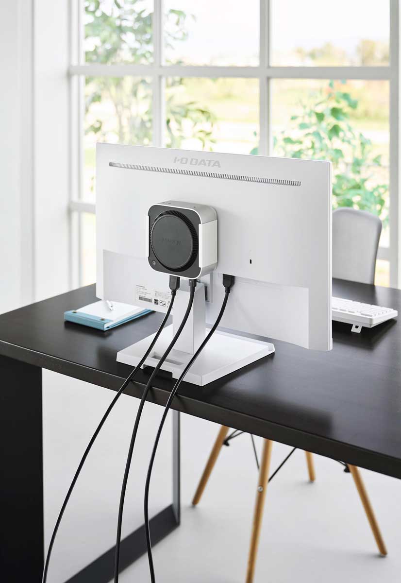 3WAYで収納できる小型PCラック XS。対応する小型PCを、モニター背面やデスク下、壁面の3通りで収納できるラックです。モニター背面のVESA規格ネジ穴に対応し、スリット穴によりモニターの支柱や配線を避けて取り付けることができます。