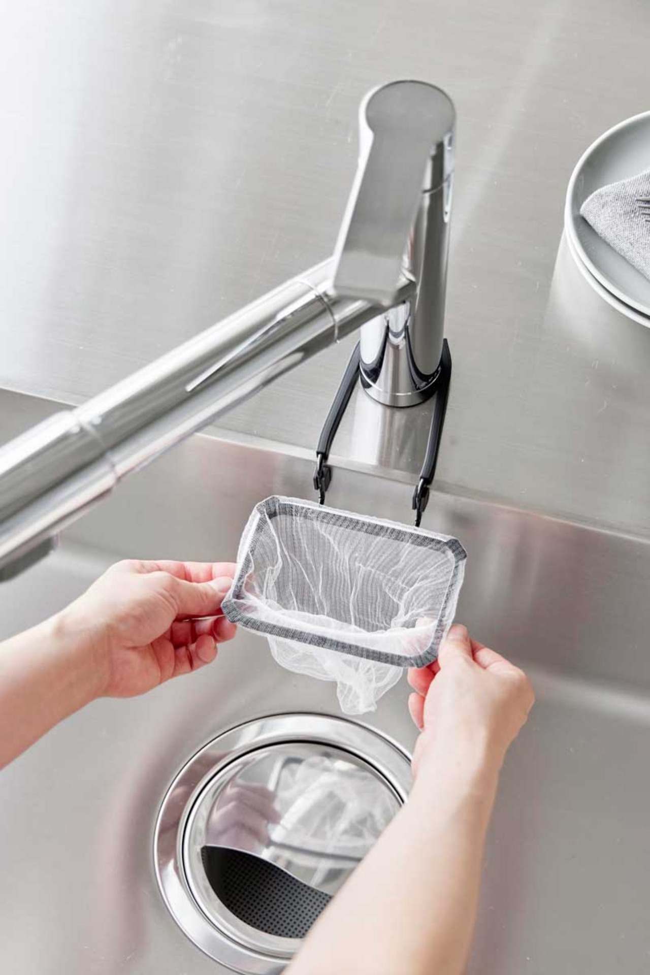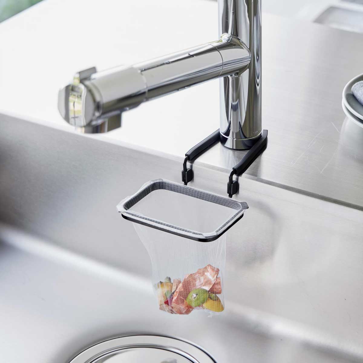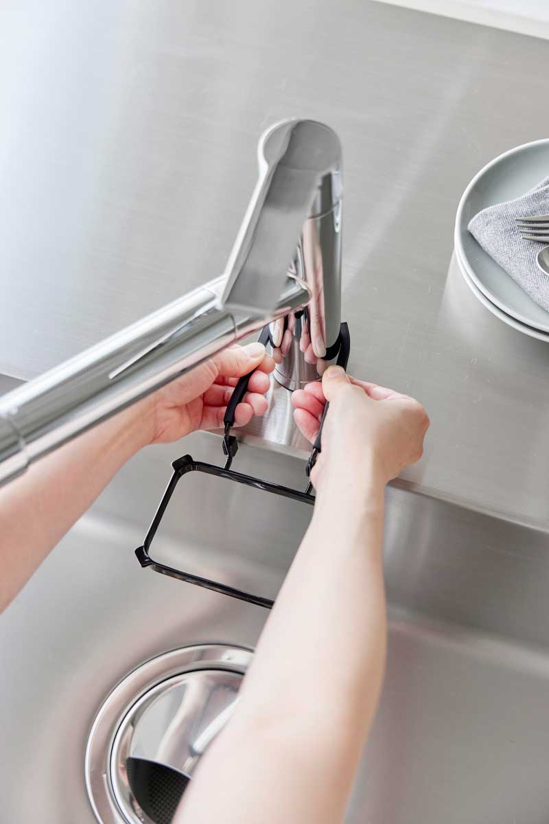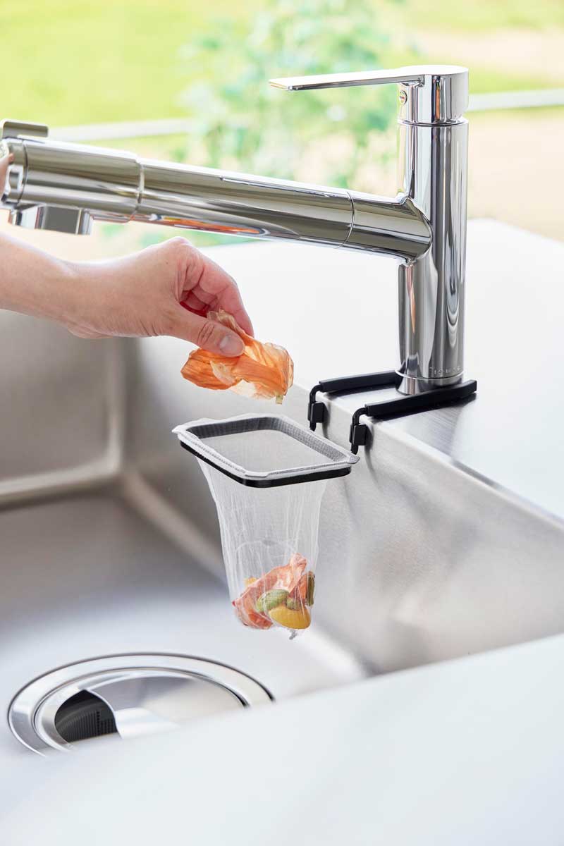 キッチンの蛇口に挟んで簡単に取り付けられる、水切りネットホルダーです。市販の水切りネットを上からかけて手軽にセットし、調理中に出た生ゴミや水分の多いゴミもシンク内でサッと捨てられます。
