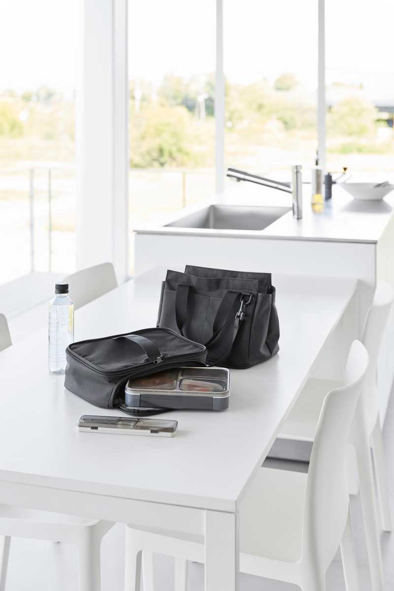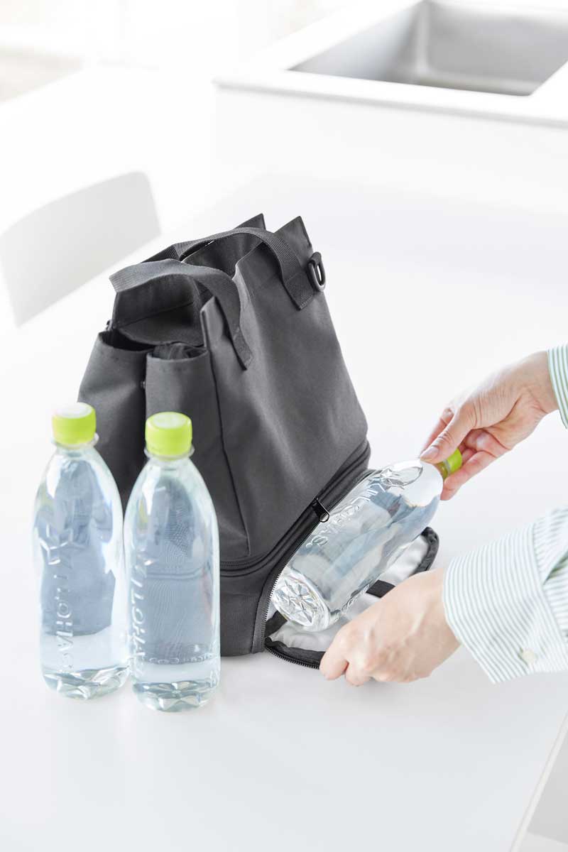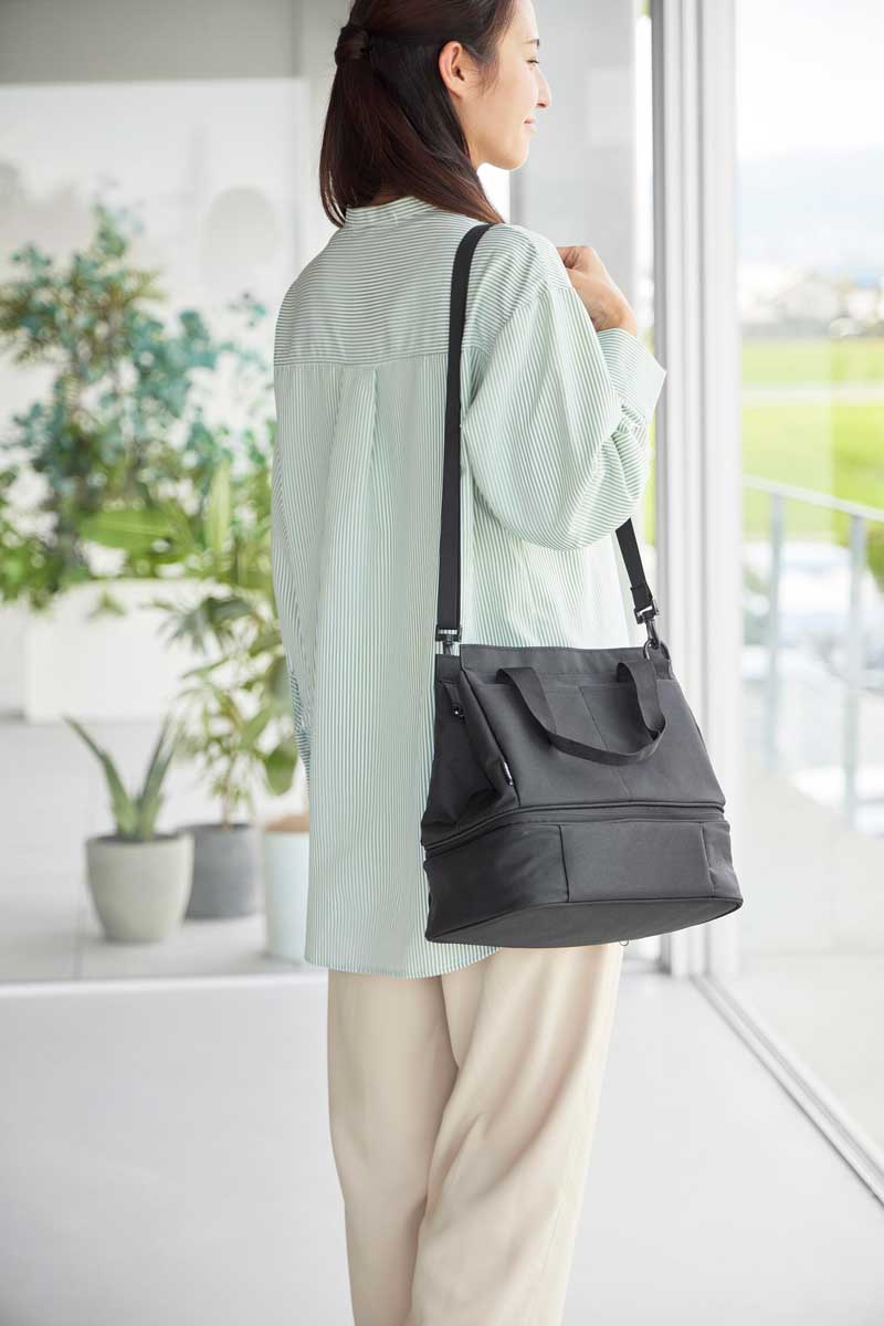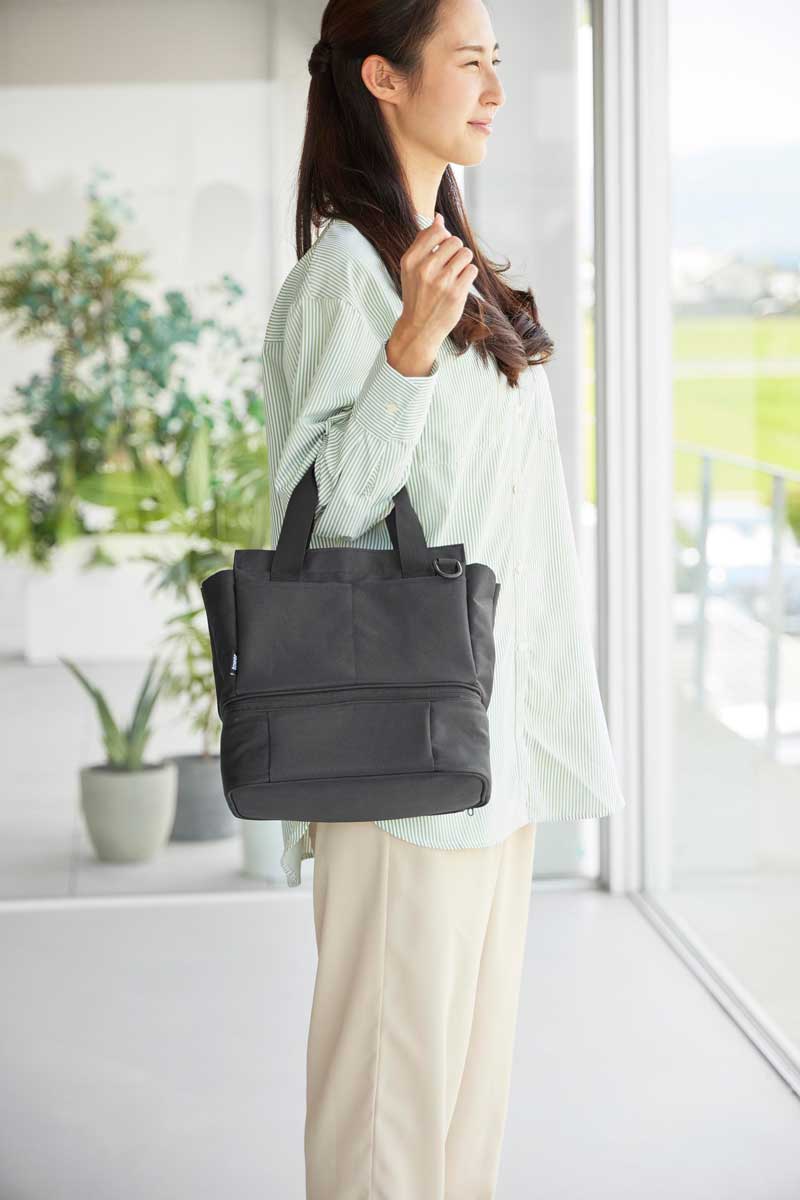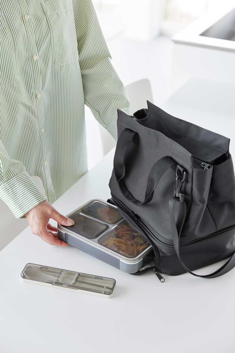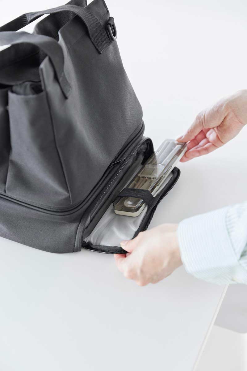 普段使いのバッグと保冷・保温機能があるランチバッグをファスナーで簡単に連結できるバッグです。用途に合わせてセパレート使いもできます。下段のランチバッグは、上下連結していても横から取り出しが可能で、取り出し口が大きく開き、お弁当を傾けずにスムーズに出し入れできます。ワンプレートの宅配弁当や幅広のお弁当箱もラクラク収納でき、500mLのペットボトルであれば3本収納可能です。