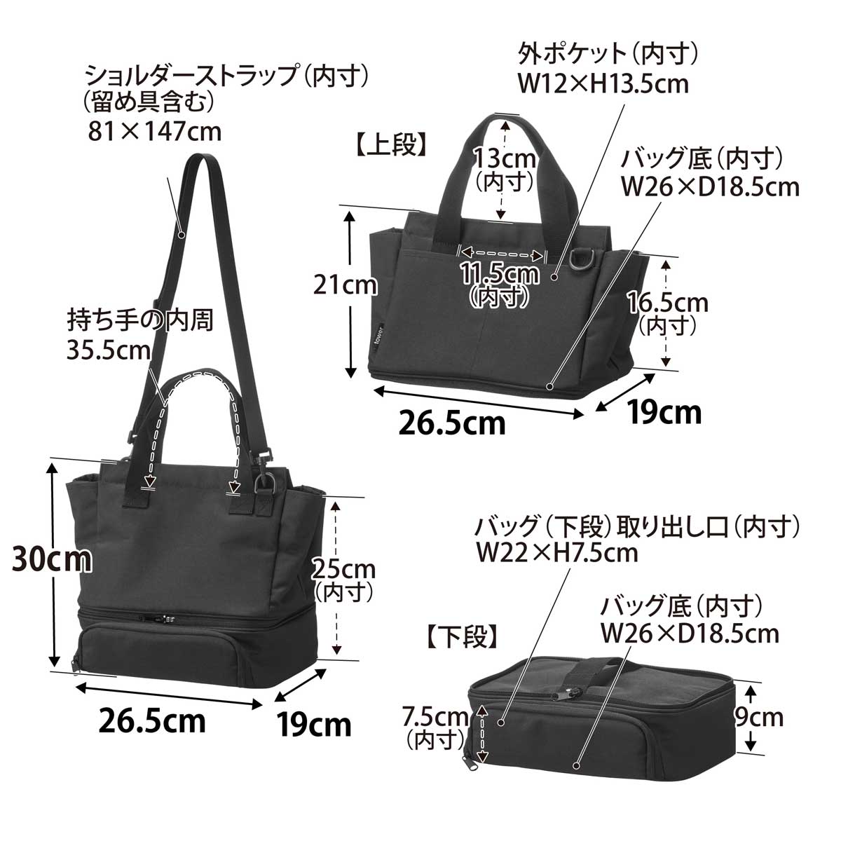 ・サイズ:約W265xD190xH300mm(持ち手、ショルダーストラップ含まず)/約W265xD190xH210mm(バッグ上段)/約W265xD190xH90mm(バッグ下段)/約810-1470mm(ショルダーストラップ長さ)