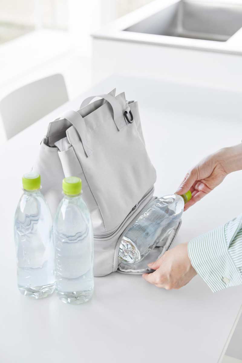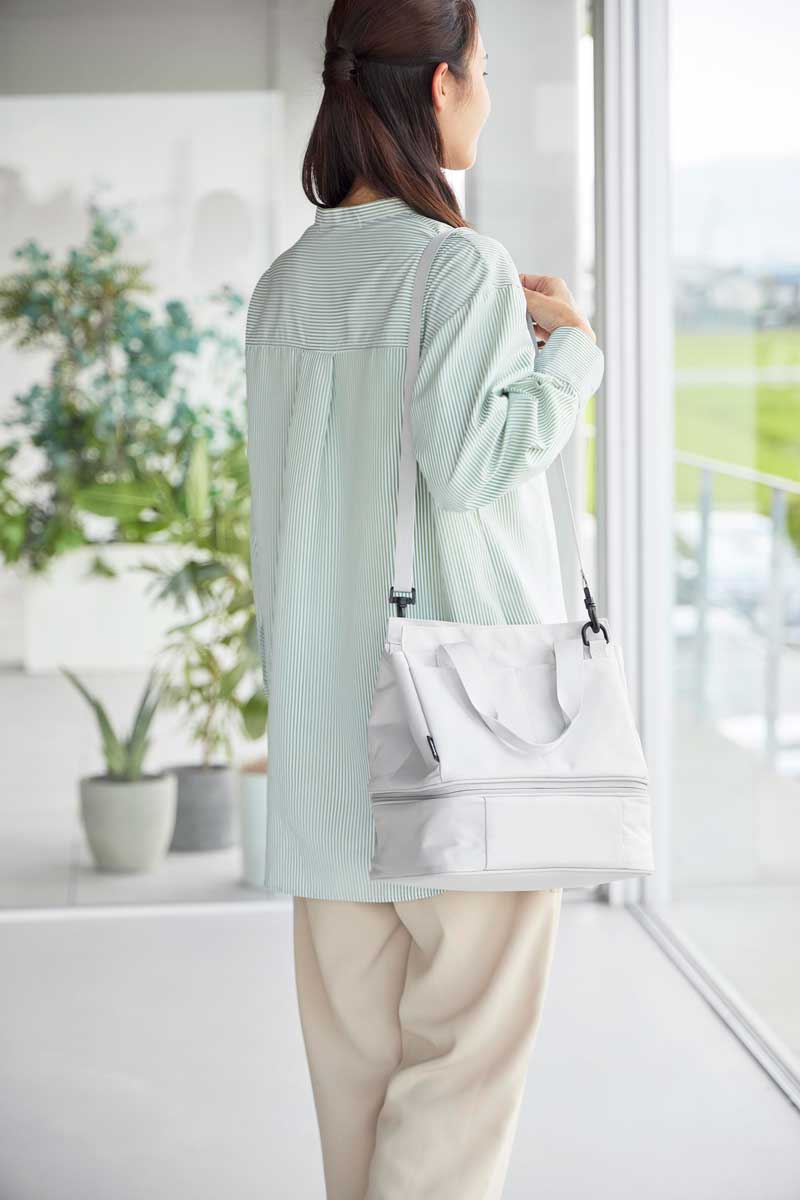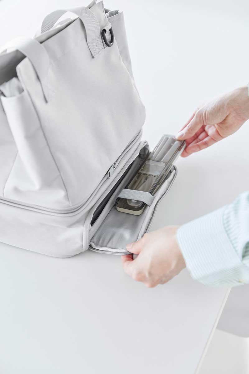 普段使いのバッグと保冷・保温機能があるランチバッグをファスナーで簡単に連結できるバッグです。用途に合わせてセパレート使いもできます。下段のランチバッグは、上下連結していても横から取り出しが可能で、取り出し口が大きく開き、お弁当を傾けずにスムーズに出し入れできます。ワンプレートの宅配弁当や幅広のお弁当箱もラクラク収納でき、500mLのペットボトルであれば3本収納可能です。