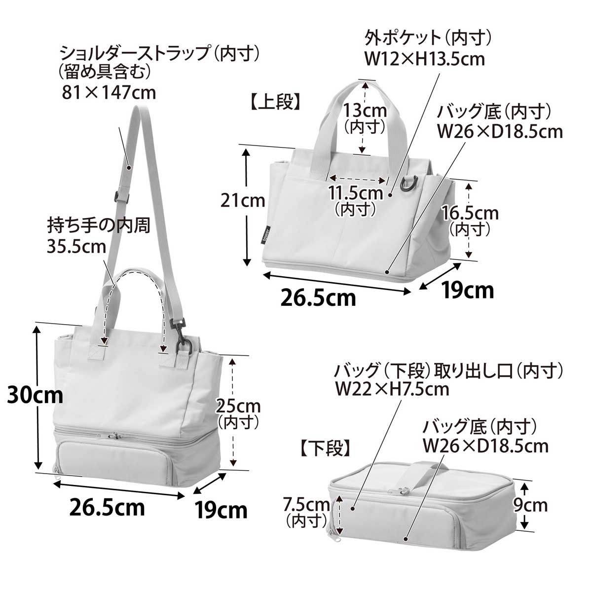 ・サイズ:約W265xD190xH300mm(持ち手、ショルダーストラップ含まず)/約W265xD190xH210mm(バッグ上段)/約W265xD190xH90mm(バッグ下段)/約810-1470mm(ショルダーストラップ長さ)