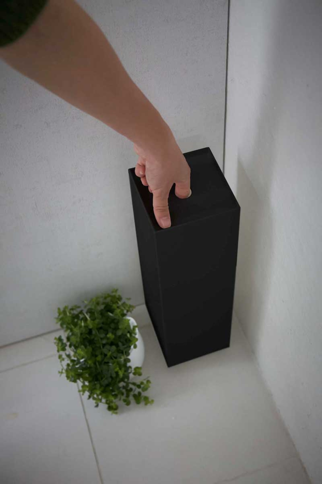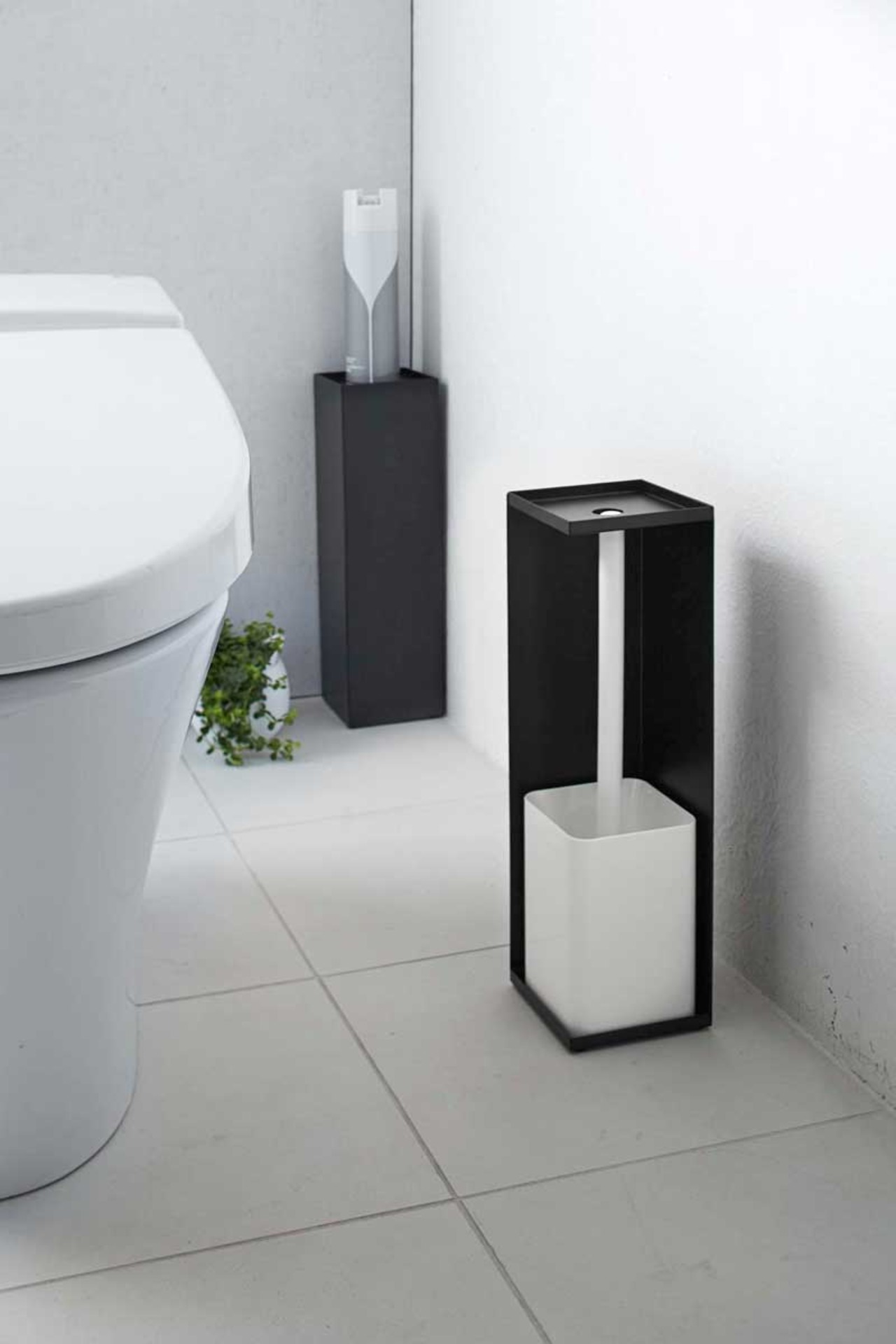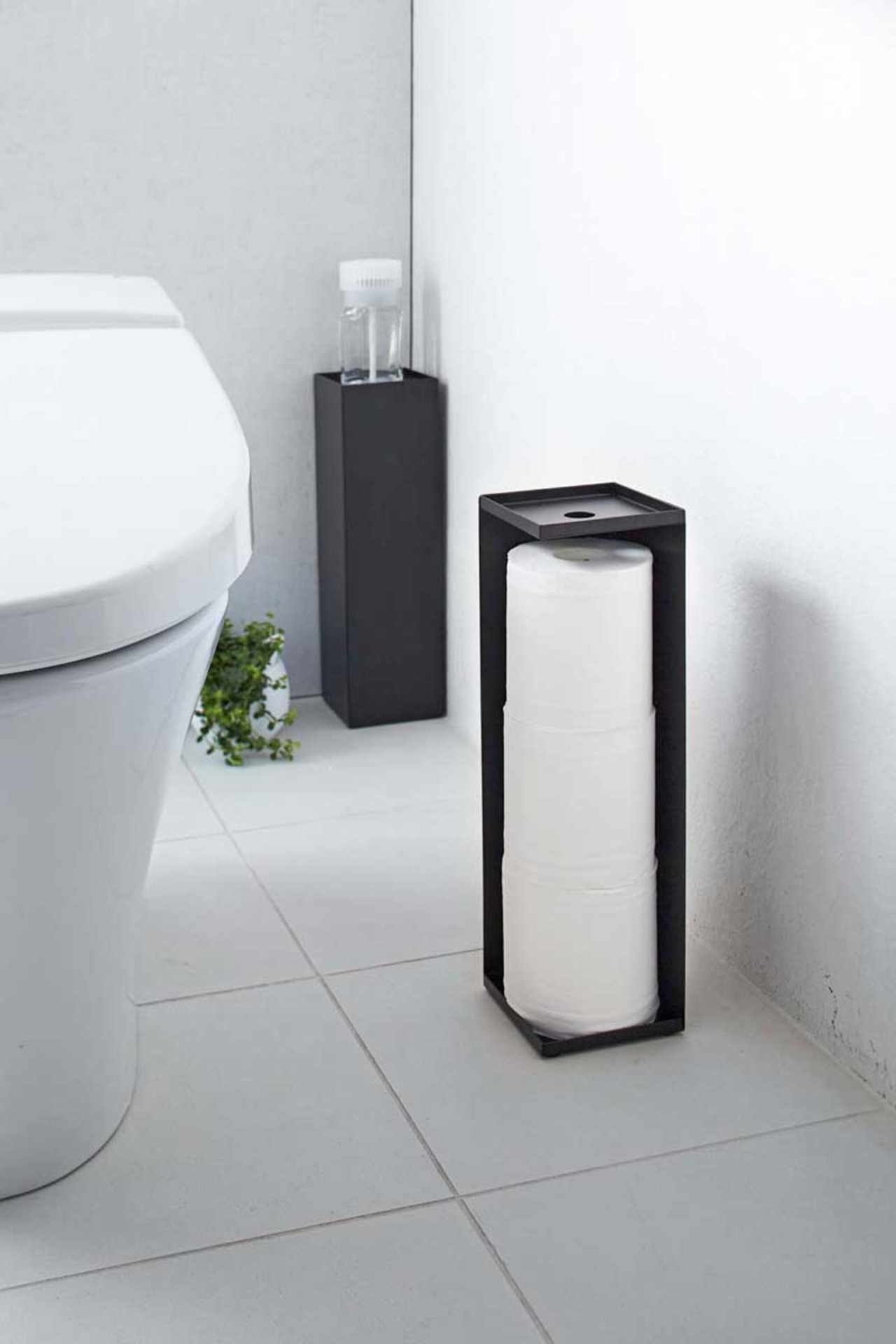 トイレットペーパーをコーナーに美しく隠して収納。コーナーに置けば存在を主張せず、空間に美しく馴染みます。 上はトレーになっているので、芳香剤や消臭スプレーを置くことができます。