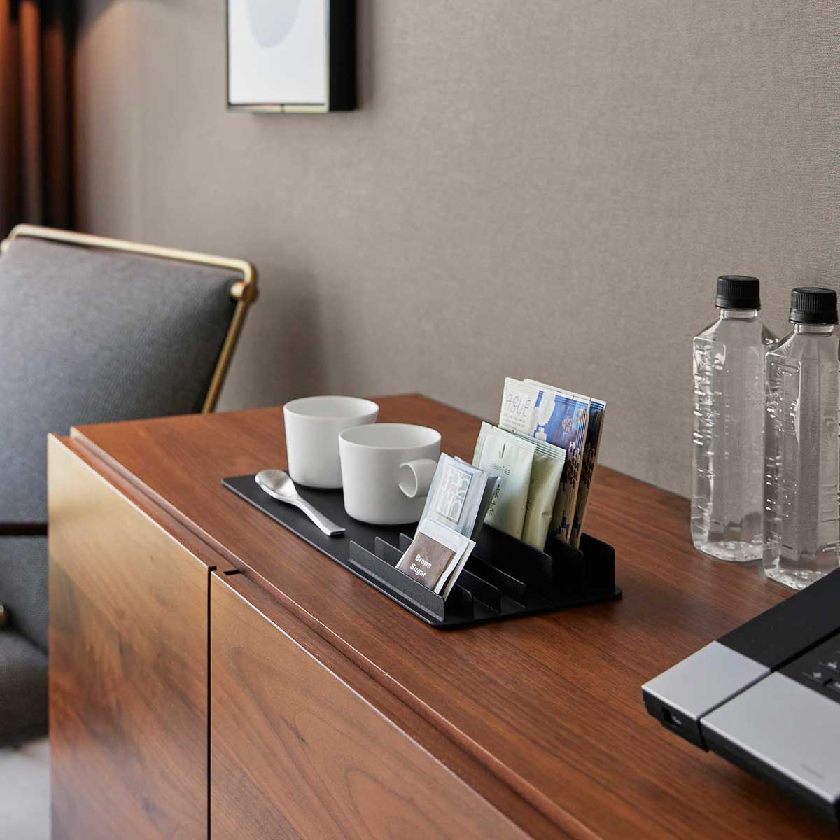 トレー部分は凹凸のないフラットな設計だから、マグカップやグラスを安定して置くことができます。また、メガネやアクセサリー類の一時置きにも便利です。宿泊施設や店舗でのアメニティ収納をはじめ、ご自宅やオフィスで使えば、清潔感のあるホテルライクな空間を手軽に演出できます。