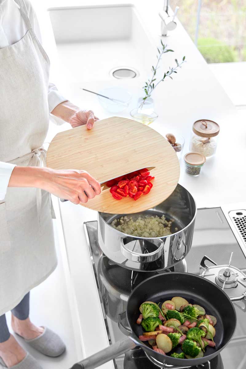 食材をまとめてカット、竹製の丸いまな板。丸型なので、カットした食材はどの方向からでもスムーズに鍋へ移せて便利。竹製で刃当たりがやわらかく包丁が長持ちし、裏面には刻印があるため、表面と裏面で使い分けて食材を区別してカットできます。