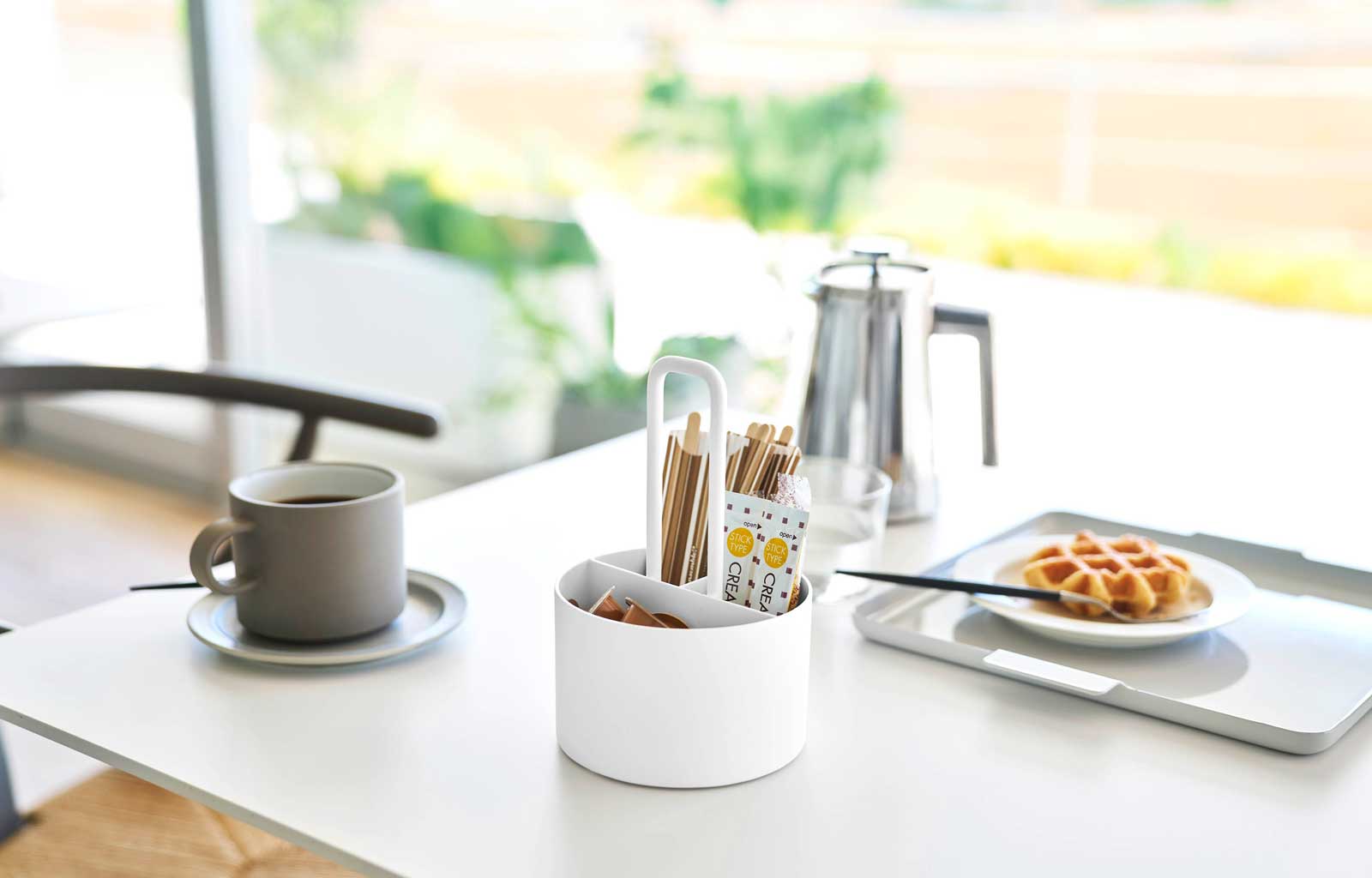 ティータイムに必要なアイテムをまとめてすっきり収納できるオーガナイザー。オーガナイザーの中は3つに仕切られているので、スティックシュガーやミルク、マドラーなどを分けて収納できます。整理しやすく、使いたい時にサッと取り出せて便利で、ハンドル付きなので持ち運びもラクです。
