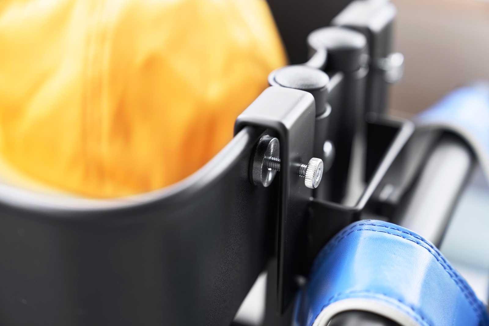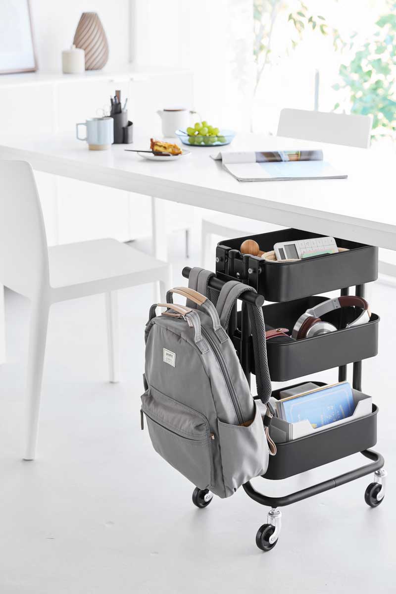 お手持ちのスチールワゴンのフチに本体を掛けるだけの簡単な取り付け方法で、調節ネジを締めてしっかりと固定できます。肩ベルトをサッと掛けてすっきり収納できます。