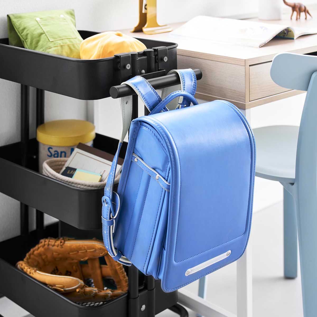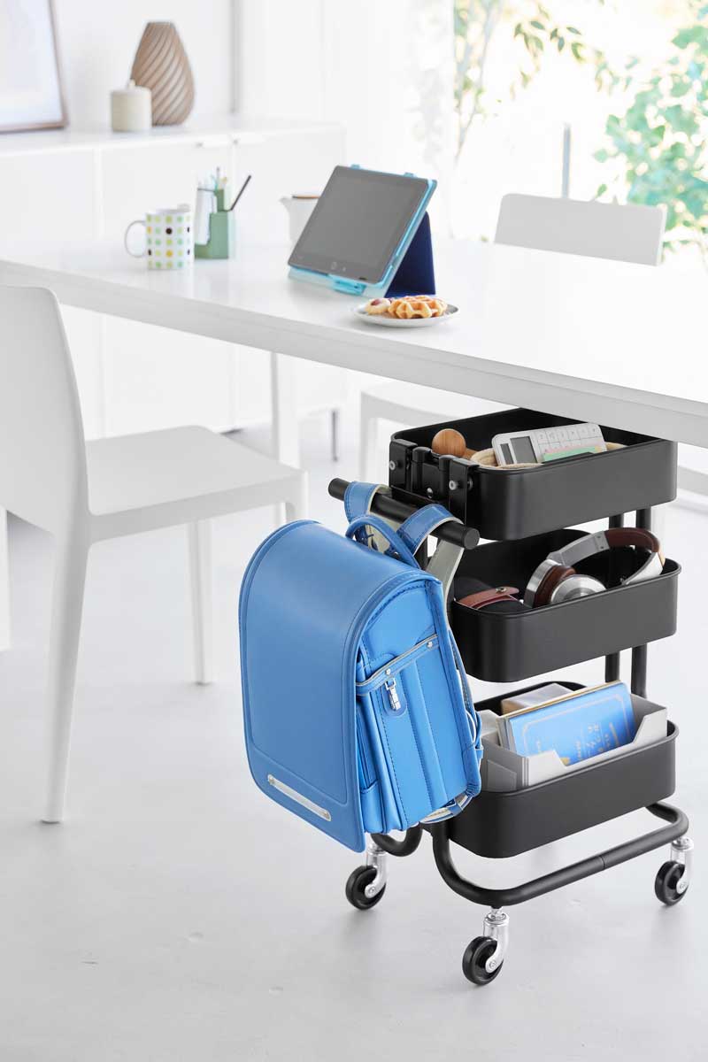 おうちのスチールワゴンに取り付けるランドセル&リュックハンガー。ランドセルやリュックを引っ掛けられる収納場所を手軽に増やせるハンガーです。子供部屋やリビングの整理に便利です。