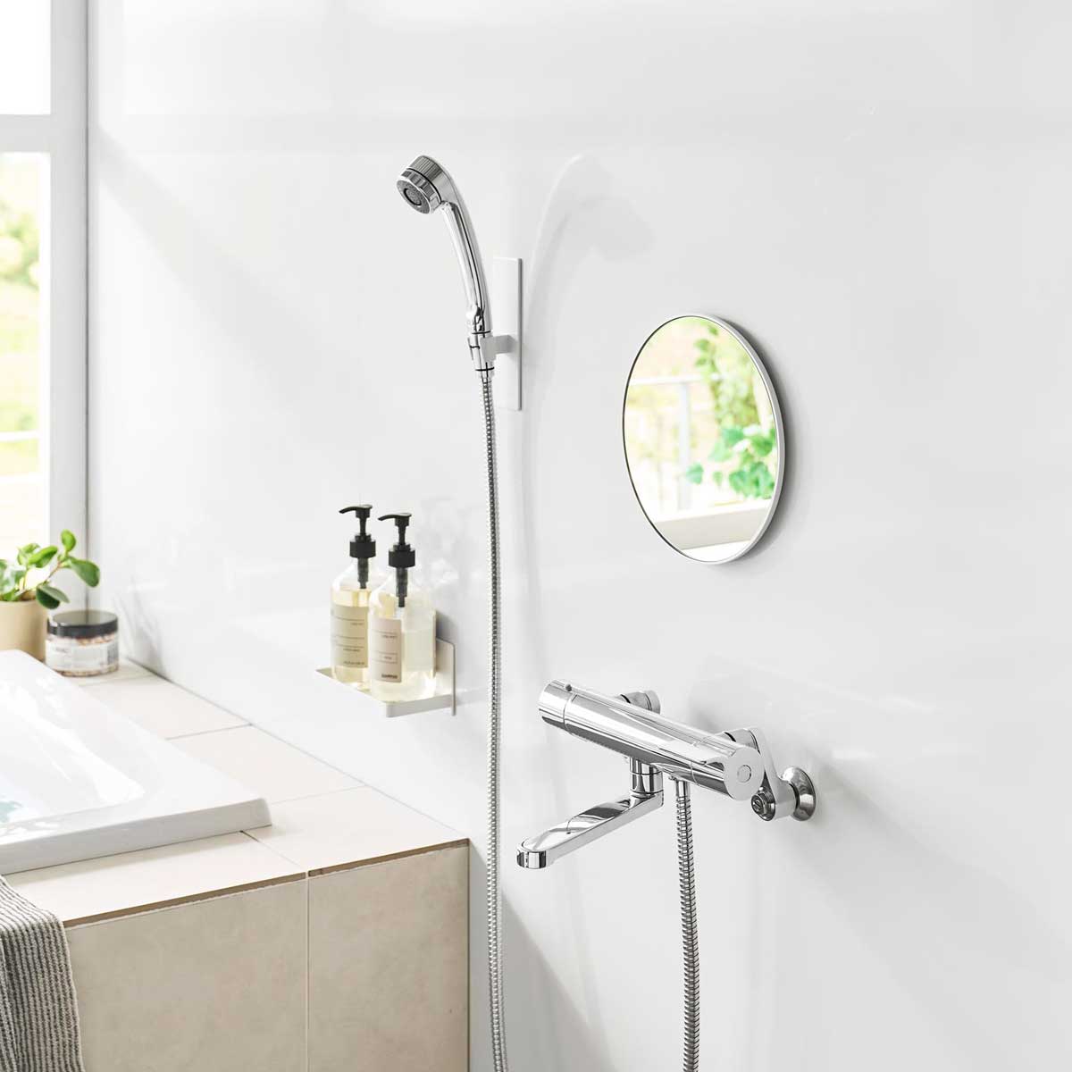 マグネットでお好みの場所に簡単に設置でき、フレームと壁の隙間に指を入れて取り外しやすい形状で、お掃除がしやすく清潔に保てます。曇り止めフィルムを全面に粘着加工しているため、鏡面が曇らず快適にお使い頂けます。