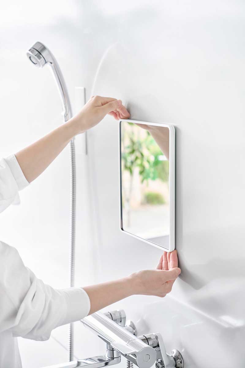 マグネットでお好みの場所に簡単に設置でき、フレームと壁の隙間に指を入れて取り外しやすい形状で、お掃除がしやすく清潔に保てます。曇り止めフィルムを全面に粘着加工しているため、鏡面が曇らず快適にお使い頂けます。