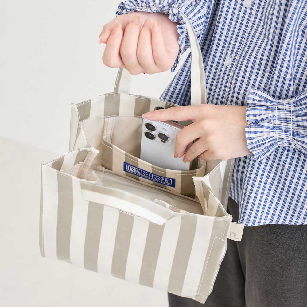 中身が見えない工夫がされている機能的なトート。本体内側に目隠し用のベロが付きで、荷物の上にベロを被せれば、中身を隠すことができます。出し入れスムーズな内側のオープンポケットは、スマホや小物の指定席。外側にもファスナー付きポケット付き。