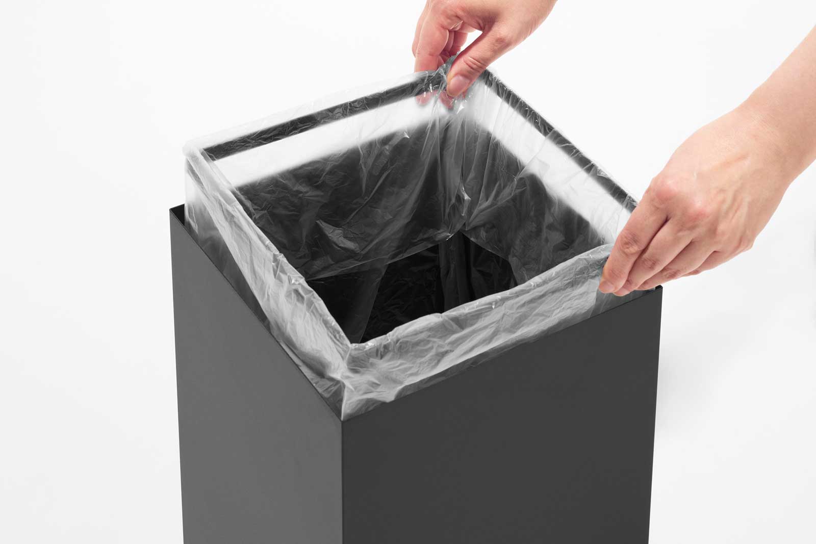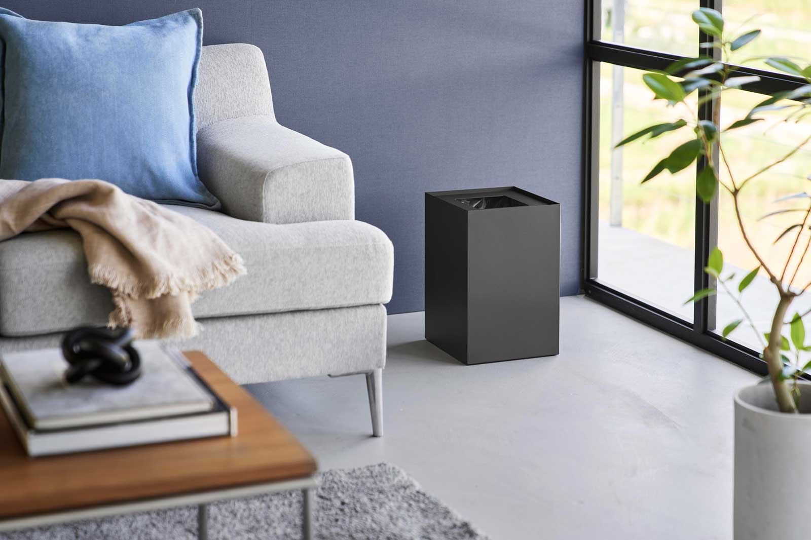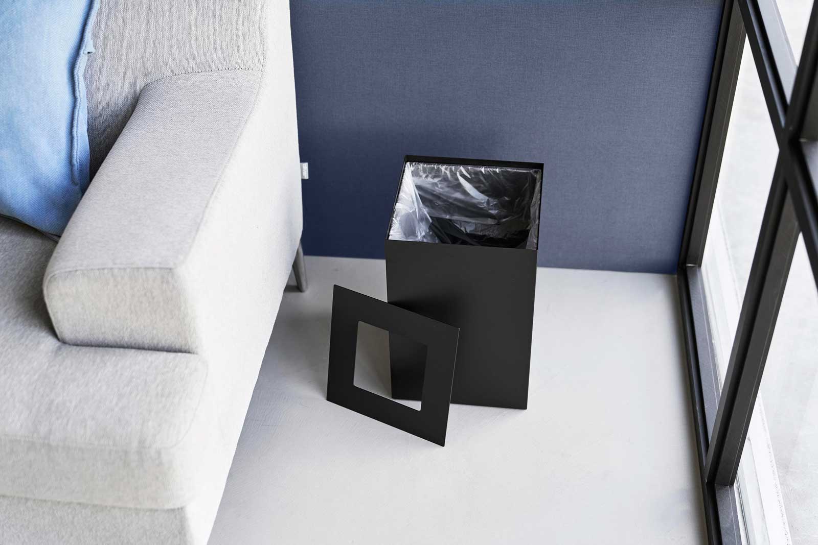 見た目も使い勝手もスマートな、スチール製のスクエア型トラッシュカンです。内側のストッパーリングでゴミ袋を固定でき、袋が見えず生活感を抑えられます。