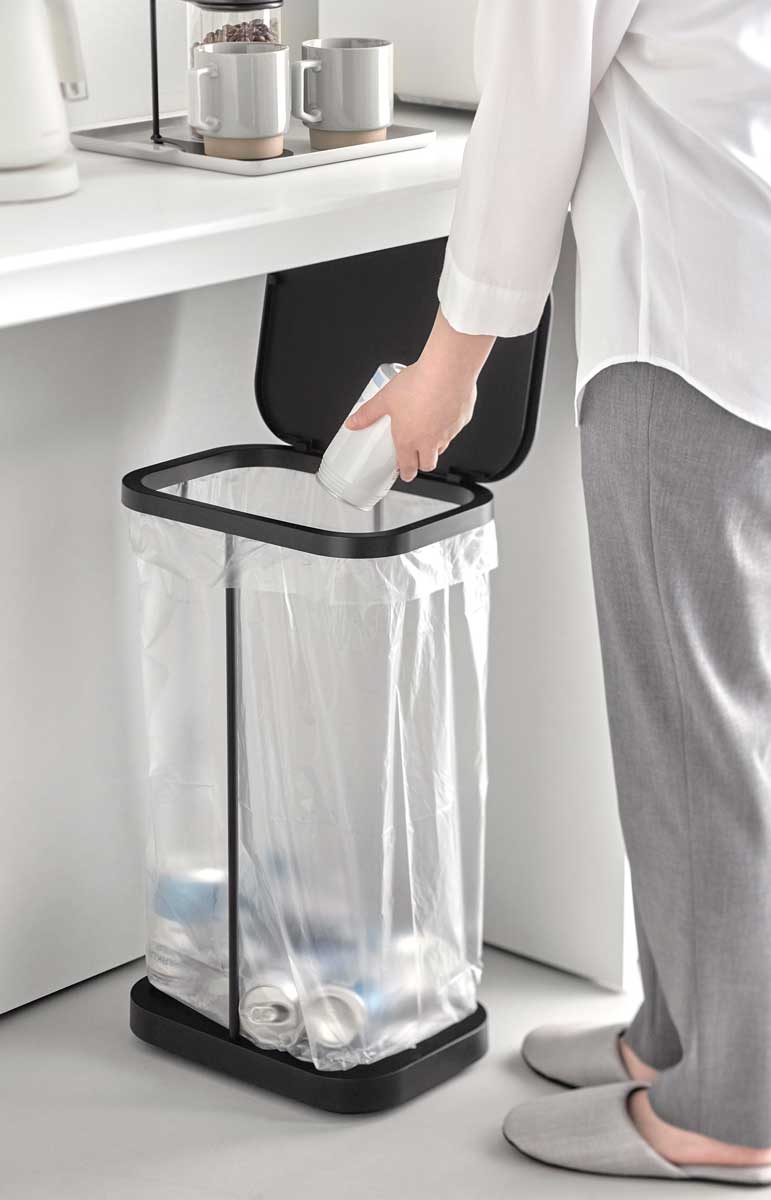 スチールフレームと蓋、台座で構成された、シンプルなゴミ袋ホルダーです。中身が見えにくく臭いも軽減できる蓋付き。外枠の制限がないので、ゴミ袋の容量いっぱいにゴミを入れられます。複数並べて使えば、ペットボトル・空き缶・資源ゴミなどの分別にも最適です。