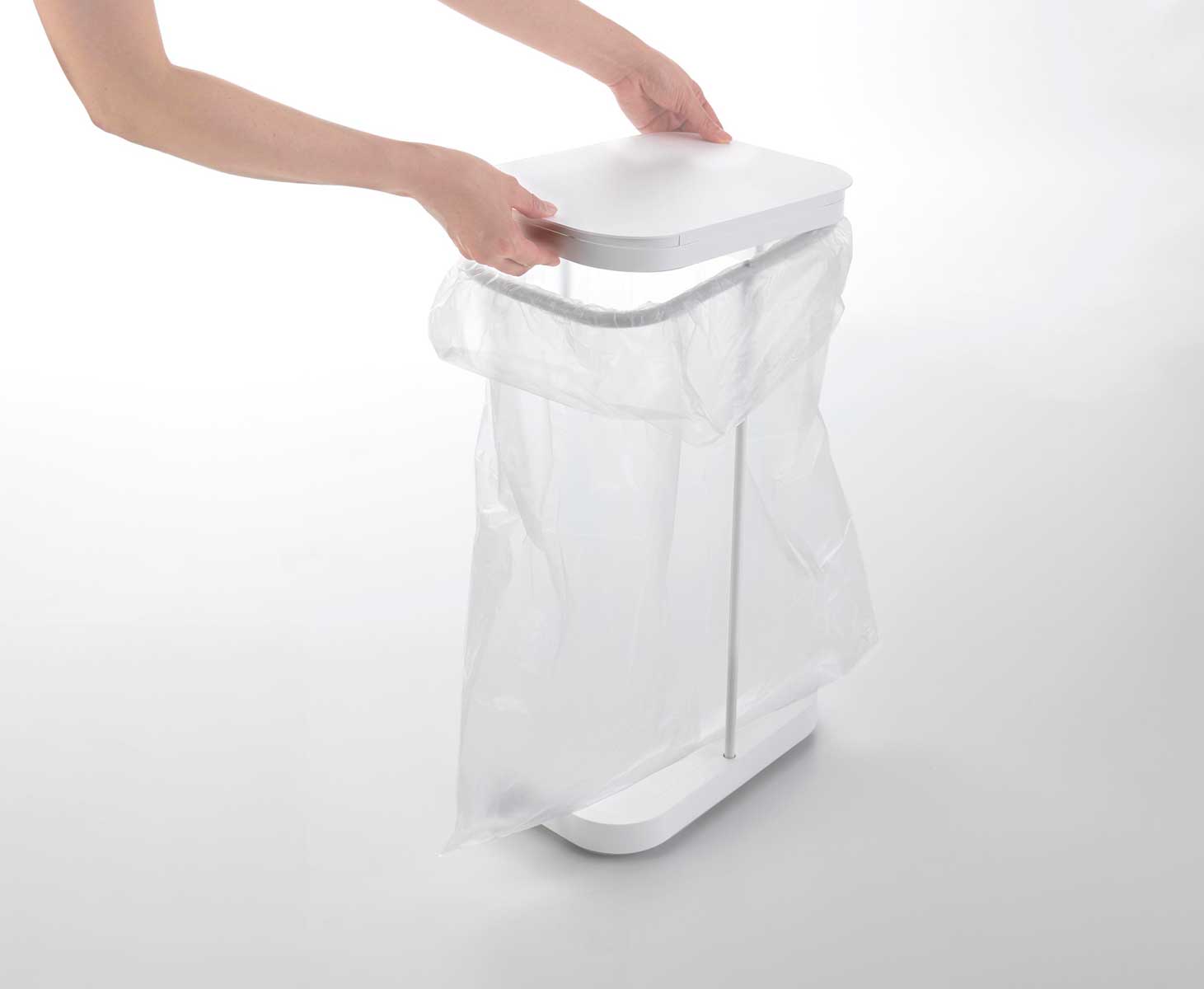 スチールフレームと蓋、台座で構成された、シンプルなゴミ袋ホルダーです。中身が見えにくく臭いも軽減できる蓋付き。外枠の制限がないので、ゴミ袋の容量いっぱいにゴミを入れられます。複数並べて使えば、ペットボトル・空き缶・資源ゴミなどの分別にも最適です。