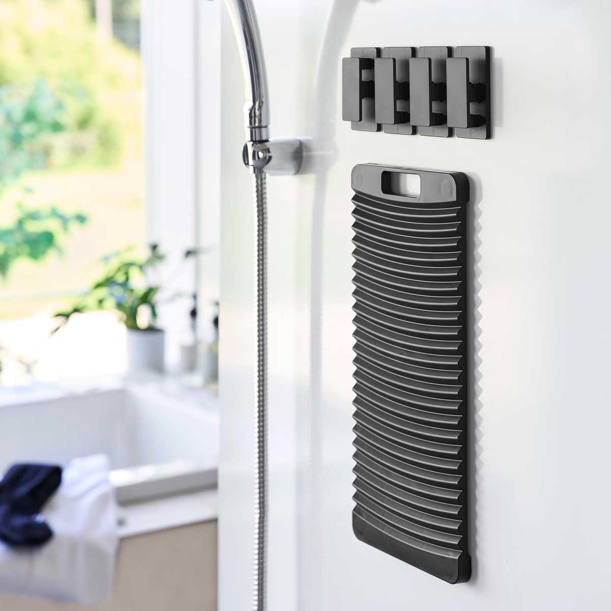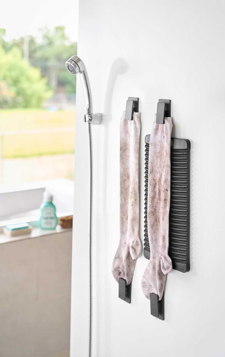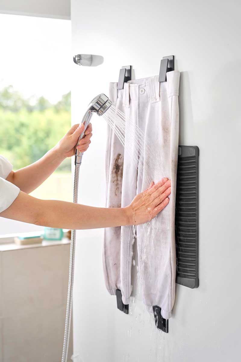 マグネットで壁面に設置できる洗濯板とクリップです。浴室の壁面に洗濯板を貼り付け、広げた洗濯物をマグネット付きクリップで固定すれば、擦り洗いがスムーズに。腰をかがめず無理のない姿勢で手洗いでき、広い範囲を一気に洗えて便利です。