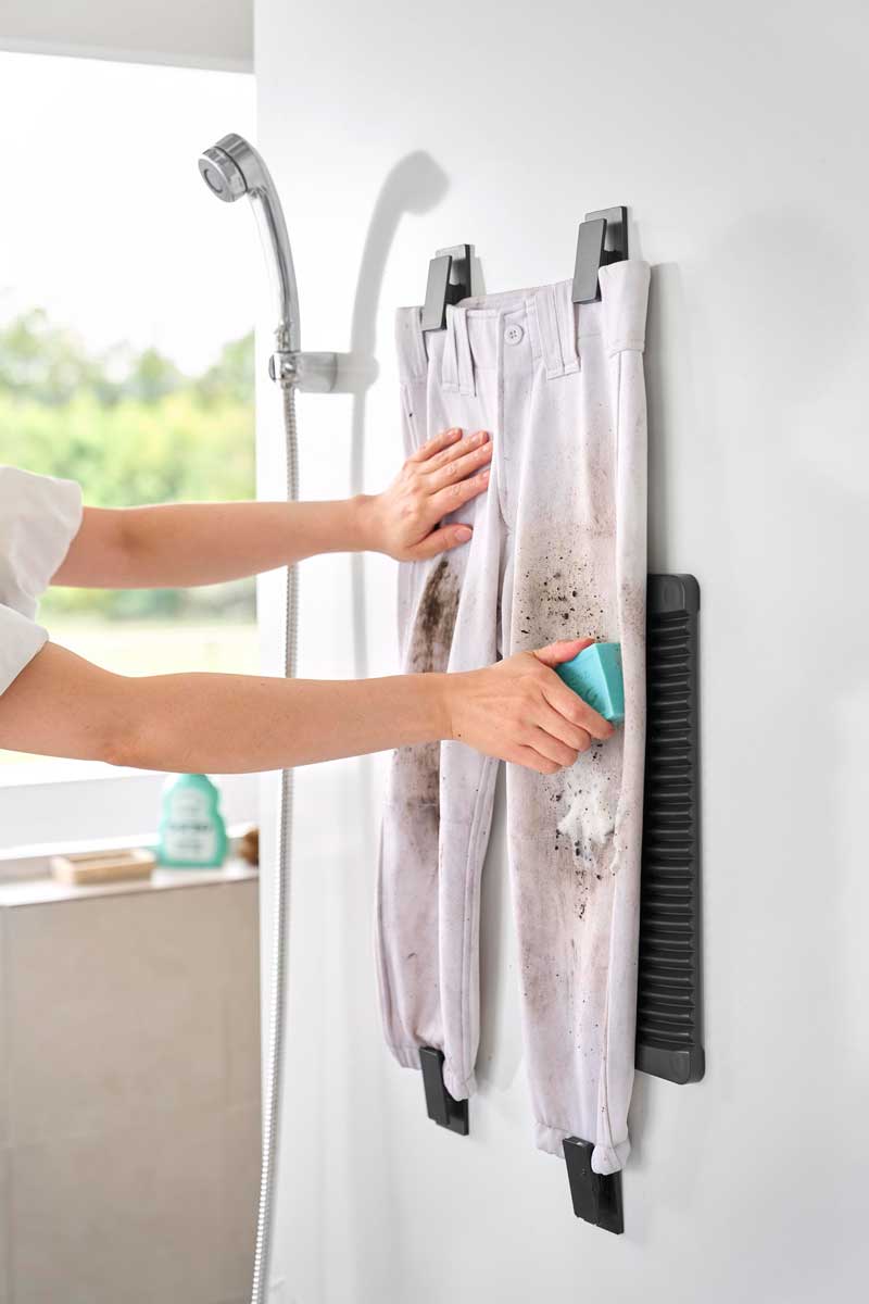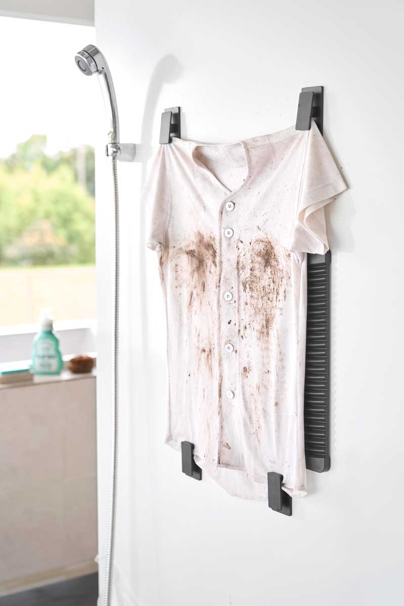 汚れの位置や洗濯物のサイズに合わせて、洗濯板やクリップの位置を簡単に調整できます。たわしやブラシを使えばさらに効率よく手洗いでき、落とした汚れはそのままシャワーでサッとすすぎ洗いできます。クリップは、洗濯以外に活用するのもおすすめです。