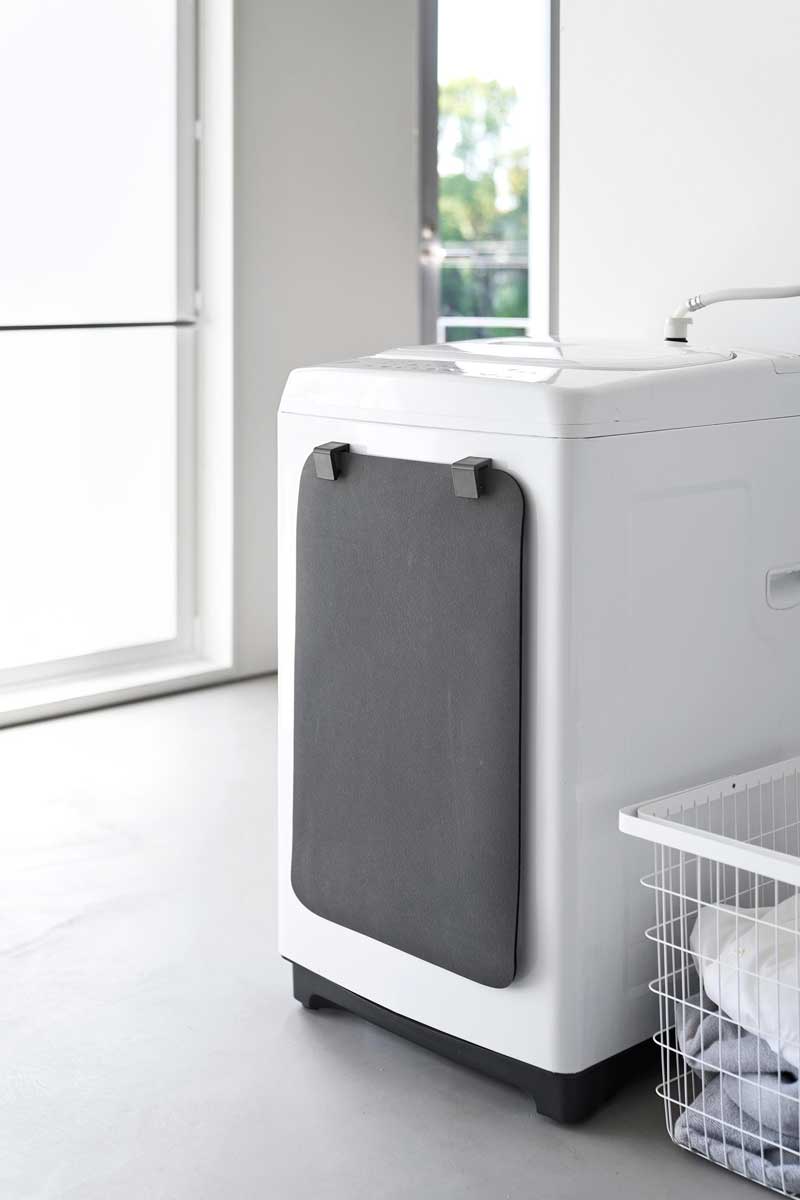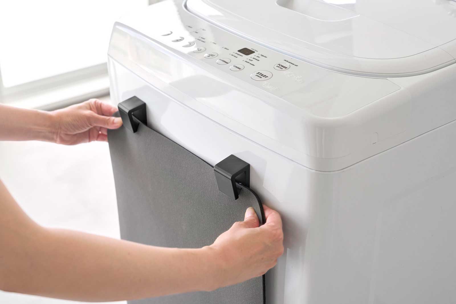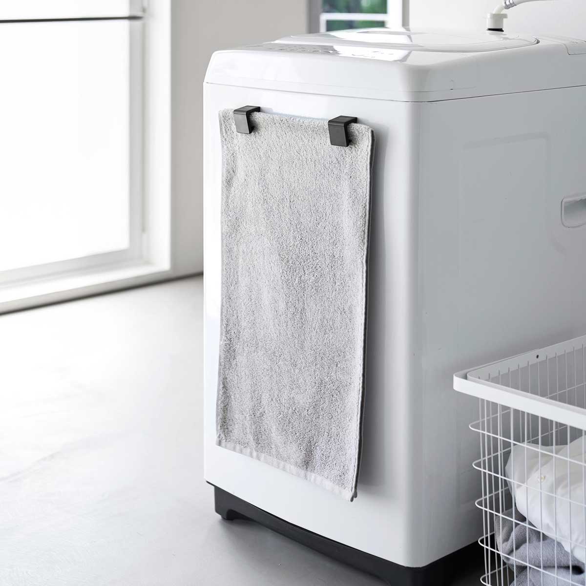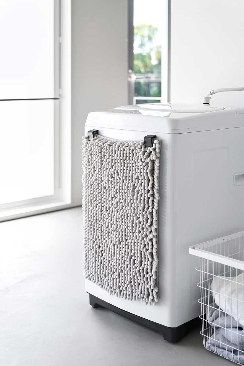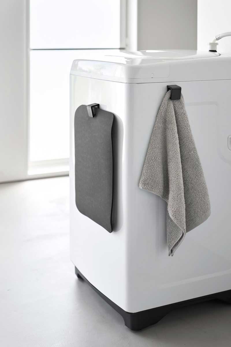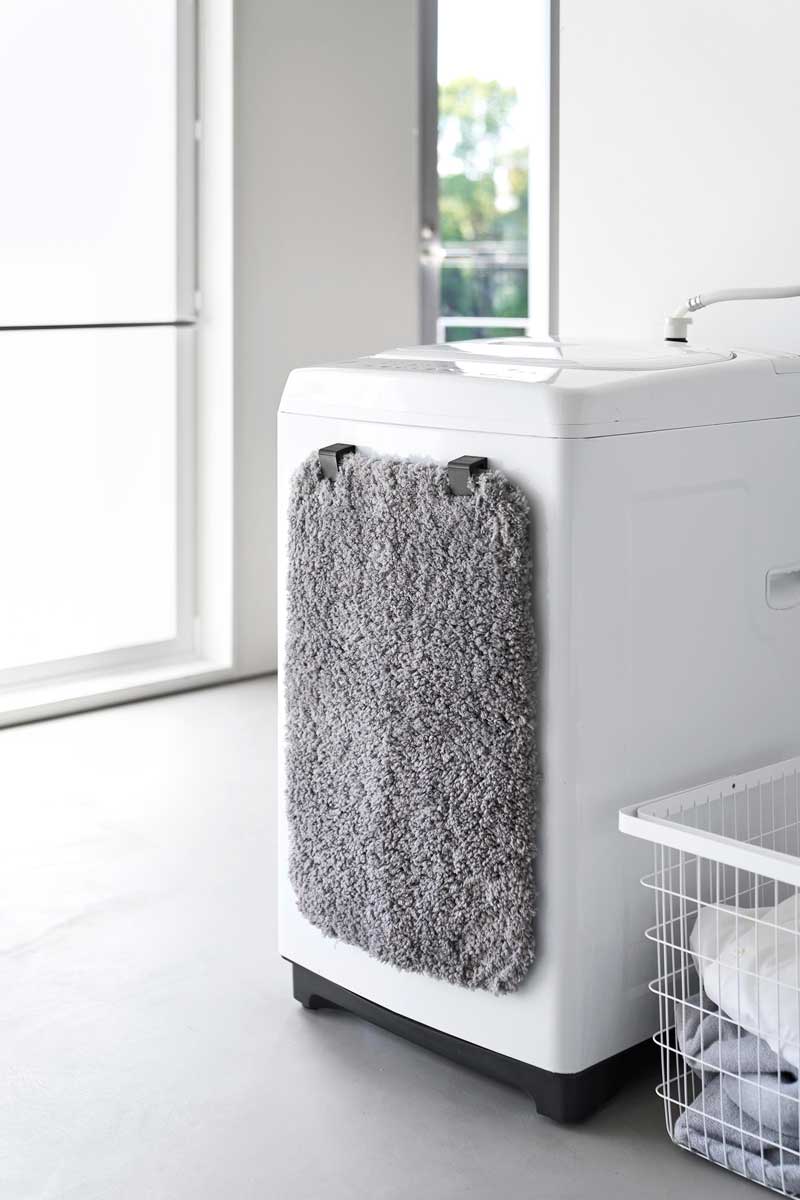 マグネットで洗濯機の側面などに簡単に取り付けられる、バスマット&バスタオルホルダー2個組です。下から差し込むと、シリコーン製のストッパーがバスマットをしっかりとキャッチし、すっきりと収納できます。