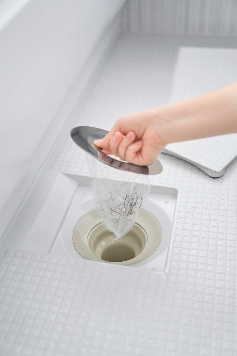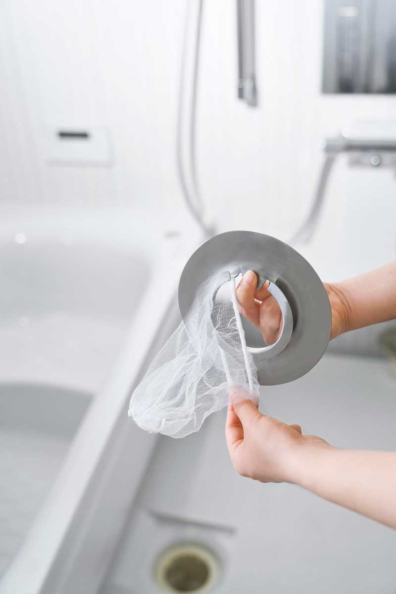 汚れにできるだけ触れずに交換できる浴室用の排水口ネットホルダー。浴室の排水口に取り付けて髪の毛やほこりをキャッチできます。市販の水切りネットをホルダーの裏側に引っ掛けて簡単にセットできる新構造で簡単セット。