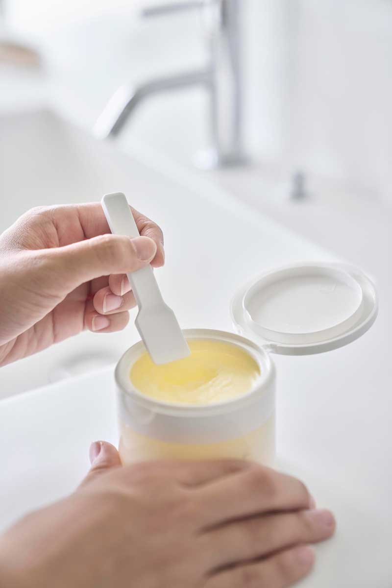 浴室などの壁面にペタッとくっつけて浮かせて収納できる、マグネット付きの化粧品用スパチュラです。先端が浮く設計で、壁面につかず衛生的。シリコーン製でしなやかなので、すくいやすく、お手入れも簡単です。