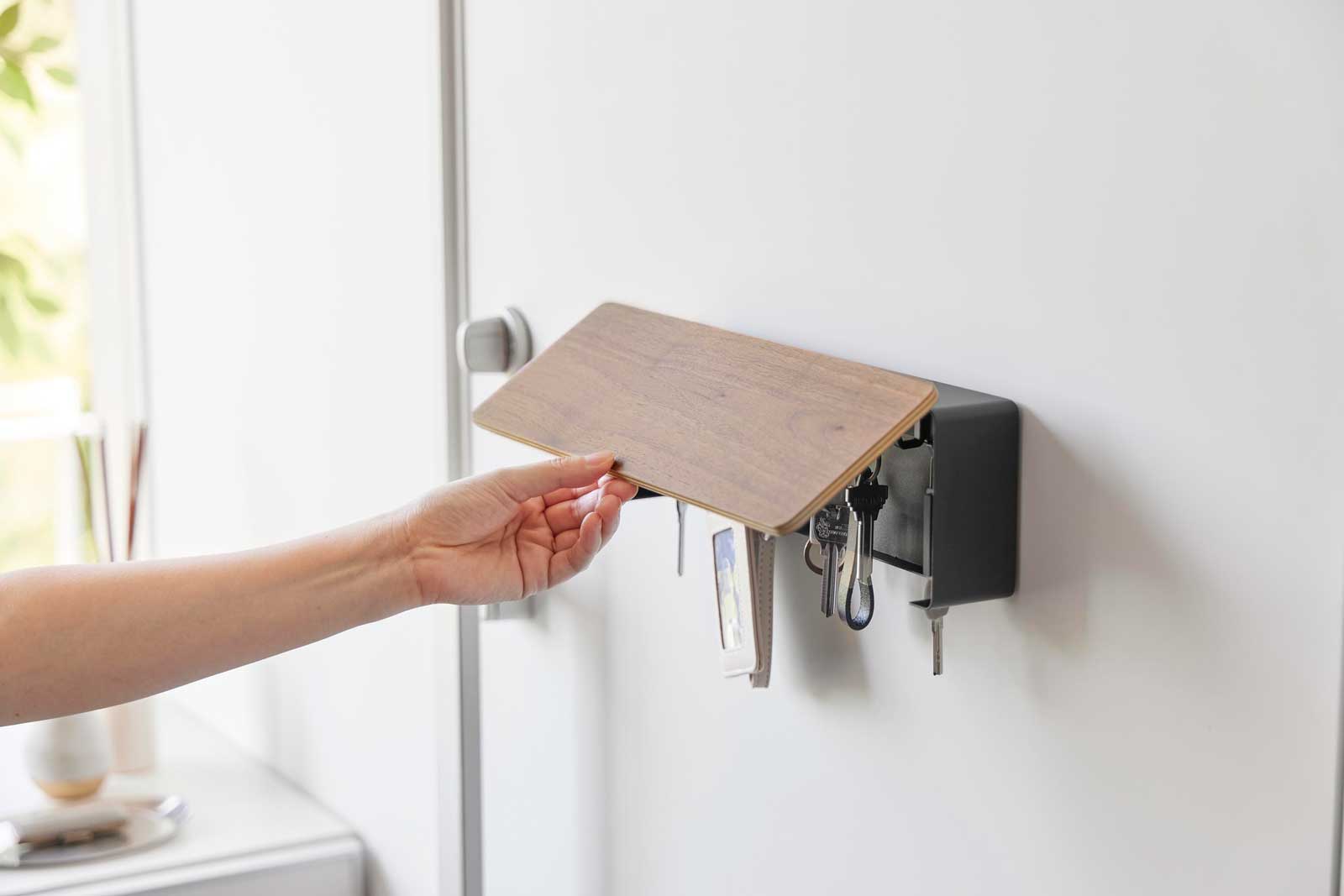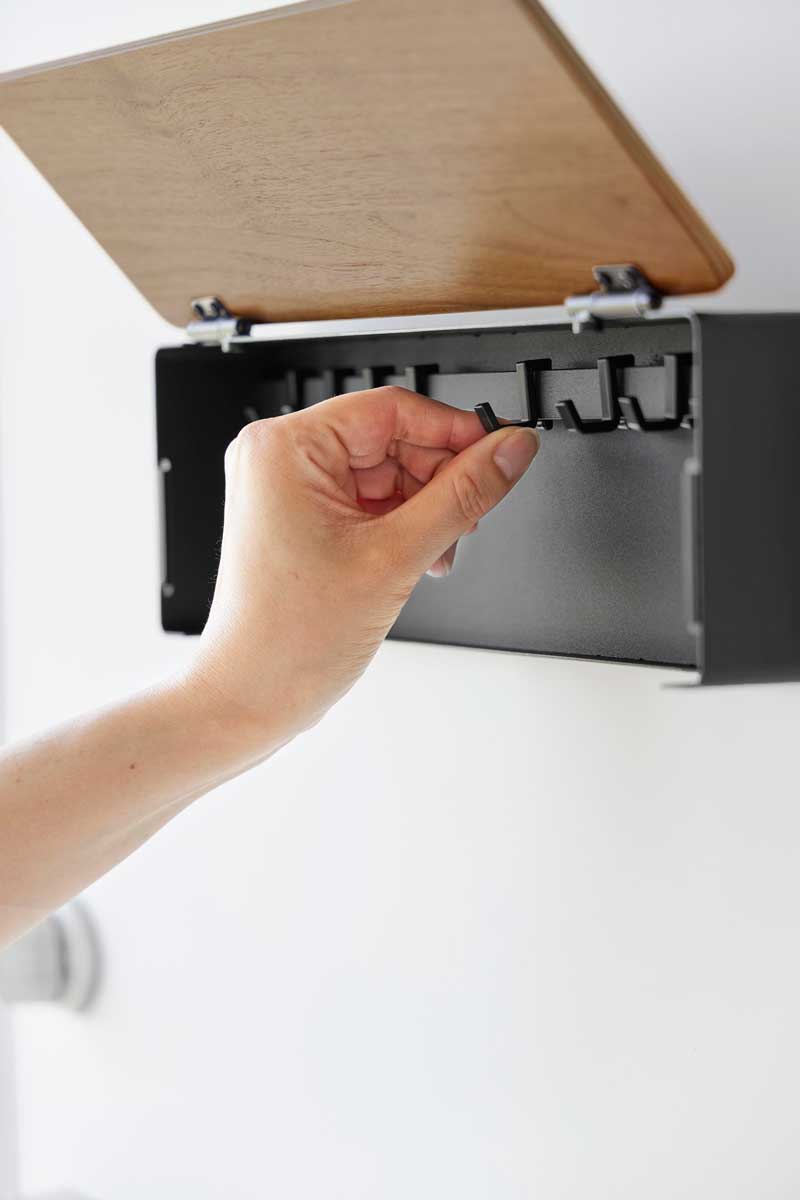 可動式フックが8個付属しており、お好みの位置に調整して取り付けられます。扉は、片手で簡単に開閉できて固定も可能なため、鍵の出し入れもスムーズ。天然木の木目が映える美しいキーフックで、温かみのあるスタイリッシュな空間を演出します。