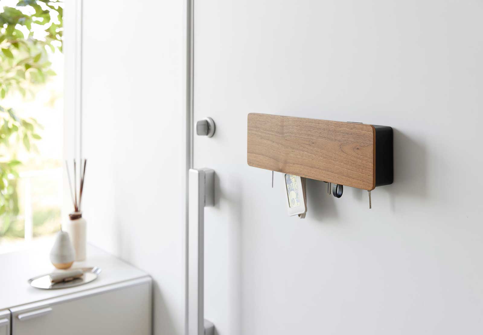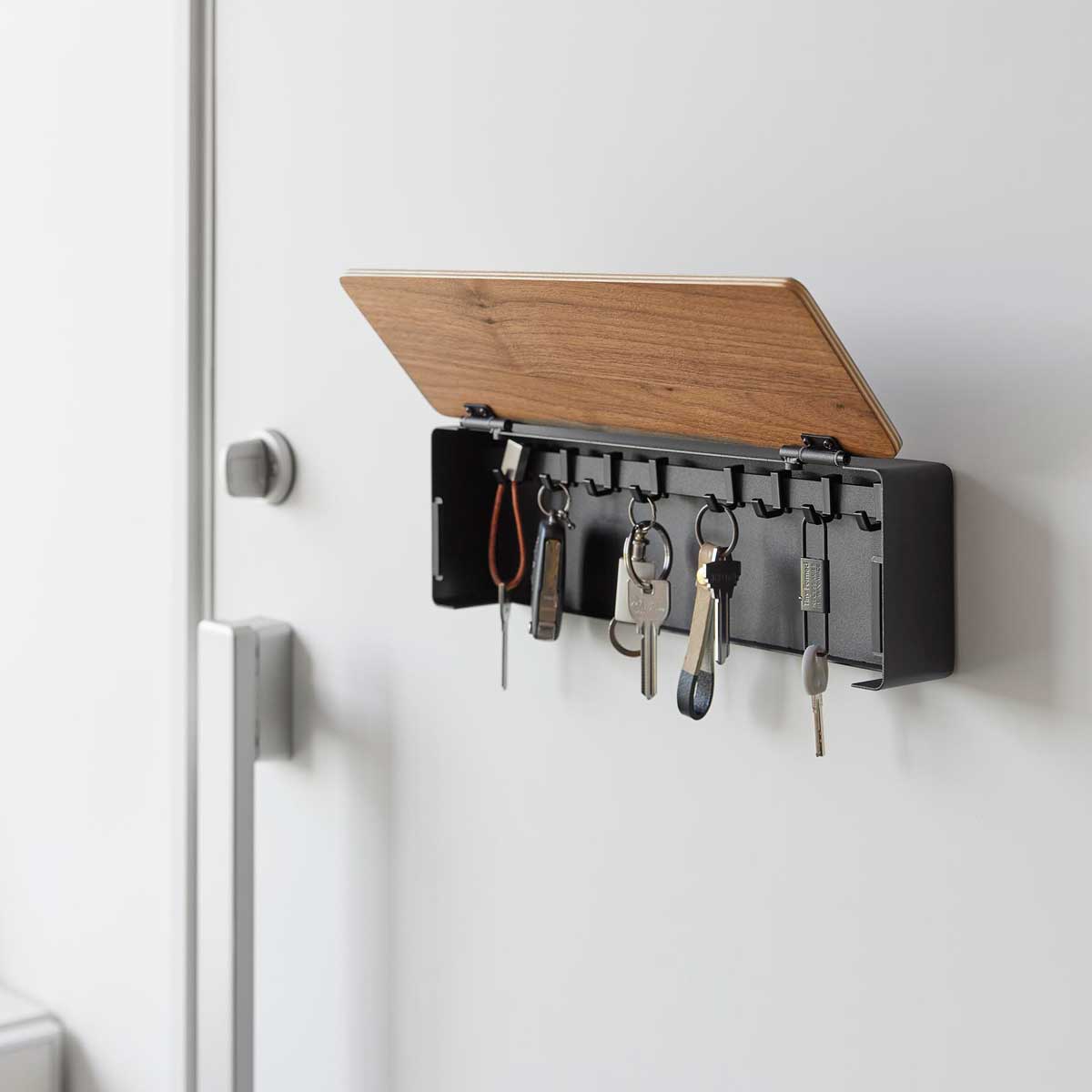 マグネットで簡単に取り付けできる扉付きキーフックです。スリムな奥行きで玄関ドアに貼り付けても場所を取らず、すっきり設置できます。本体下があいているので、鍵の長さを気にせず収納可能で、キーケースやICカードケースも掛けられて便利です。
