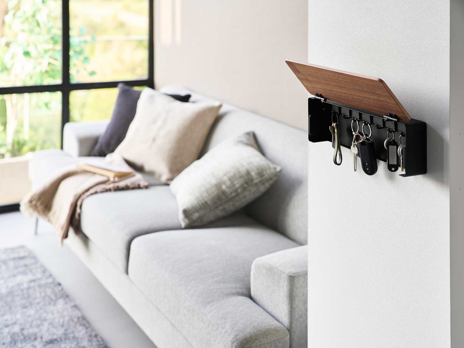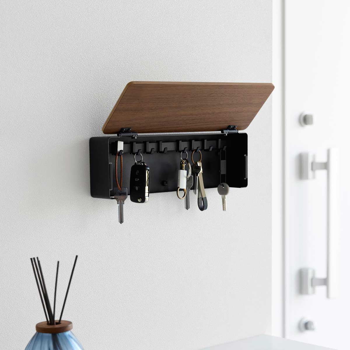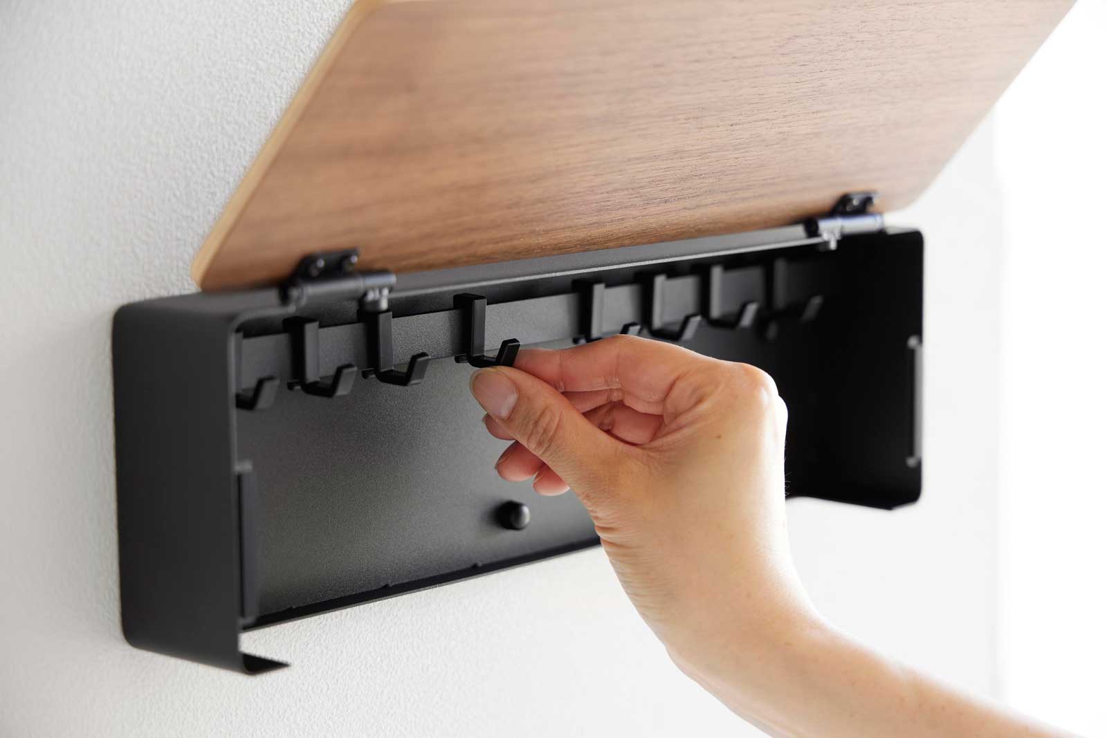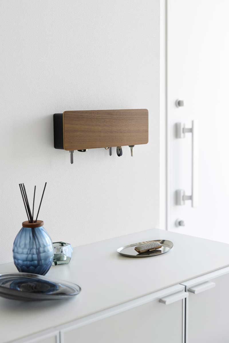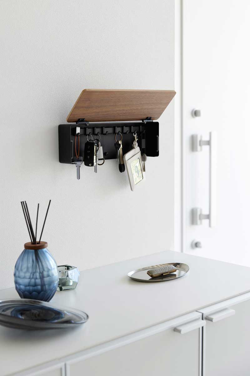 可動式フックが8個付属しており、お好みの位置に調整して取り付けられます。スチール製の本体にはマグネット小物なども取り付け可能。扉は、片手で簡単に開閉できて固定も可能なため、鍵の出し入れもスムーズ。天然木の木目が映える美しいキーフックで、温かみのあるスタイリッシュな空間を演出します。